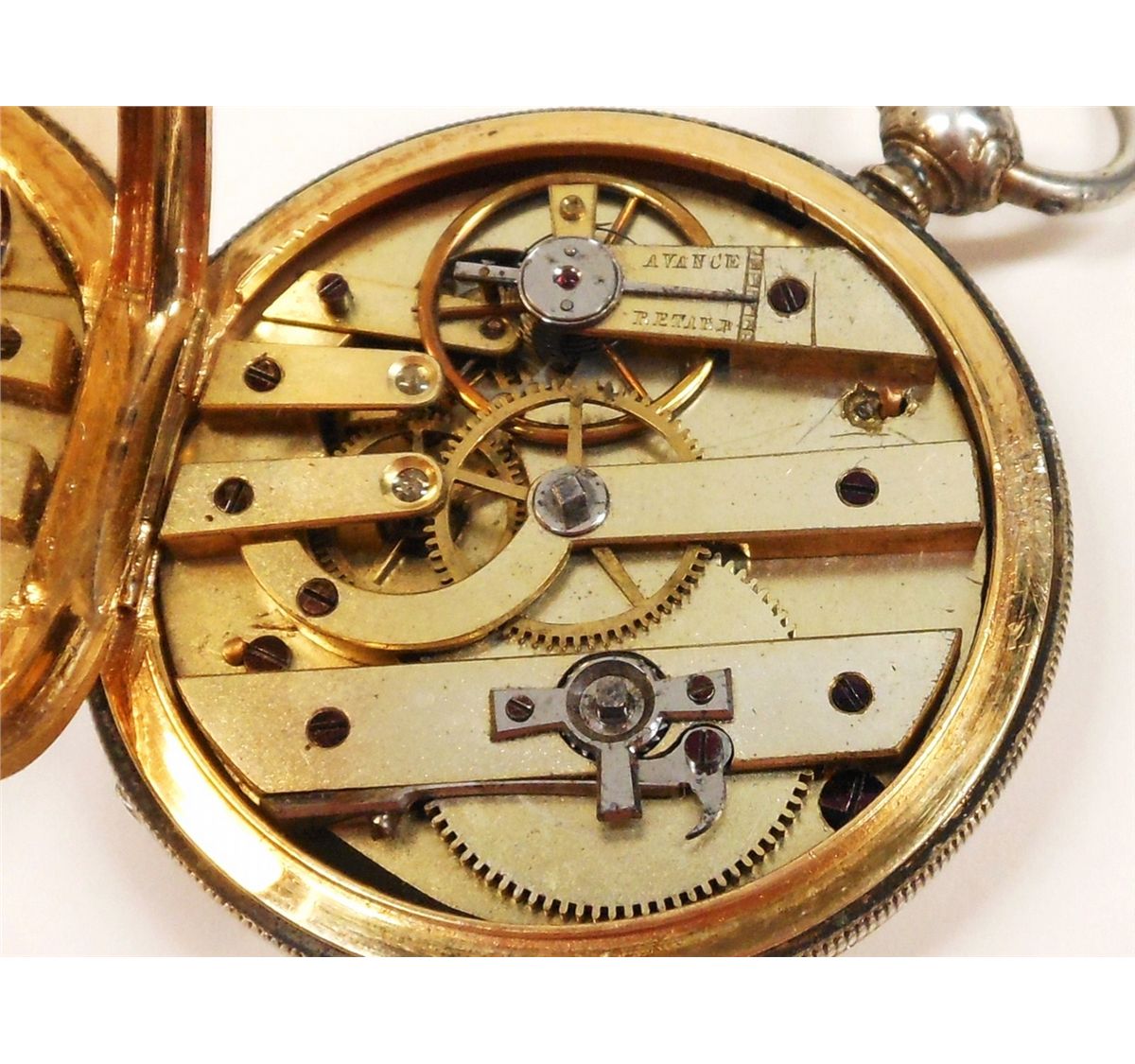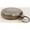 2" Diameter. Archard & Fils Keywind Pocket Watch with Key. Circa 1800's. Geneva, Switzerland. Cylinder Escapement Movement. Silver Hunter Case with Dust Cover engraved with a hunting scene on one side and building on the side. 8 Jewels. Missing the Secondhand. Working. Great Condition