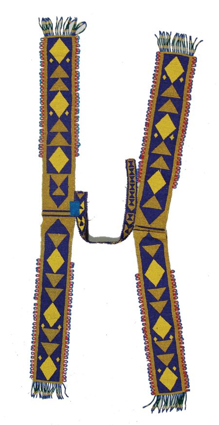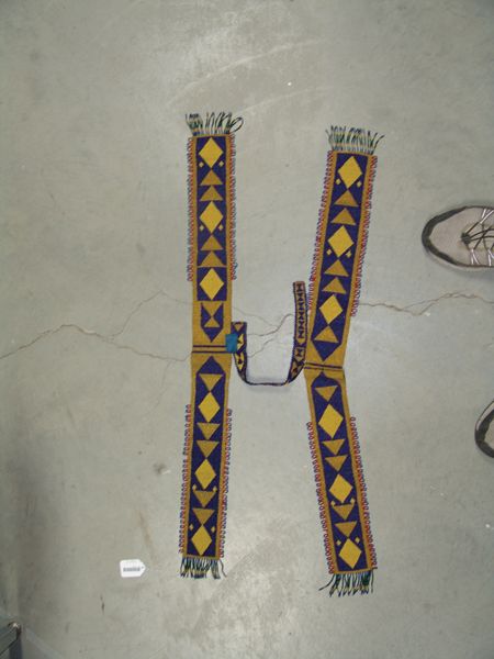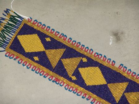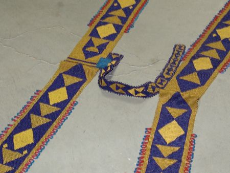 Ca. 1940s, Vintage loom beaded dancers shoulder straps done with beautiful gold and royal beads. Good condition, has some native repair. Ex. Puffer Collection. 4" x 39"