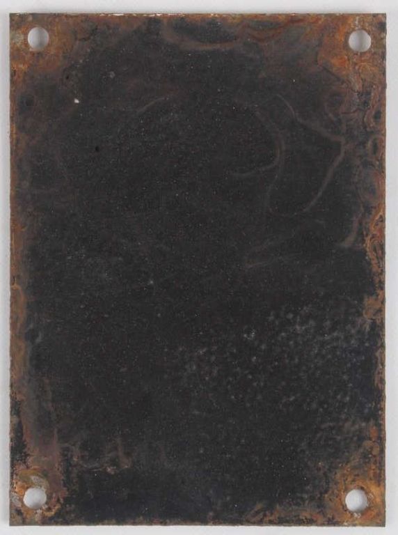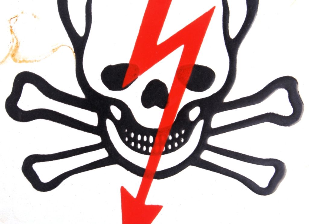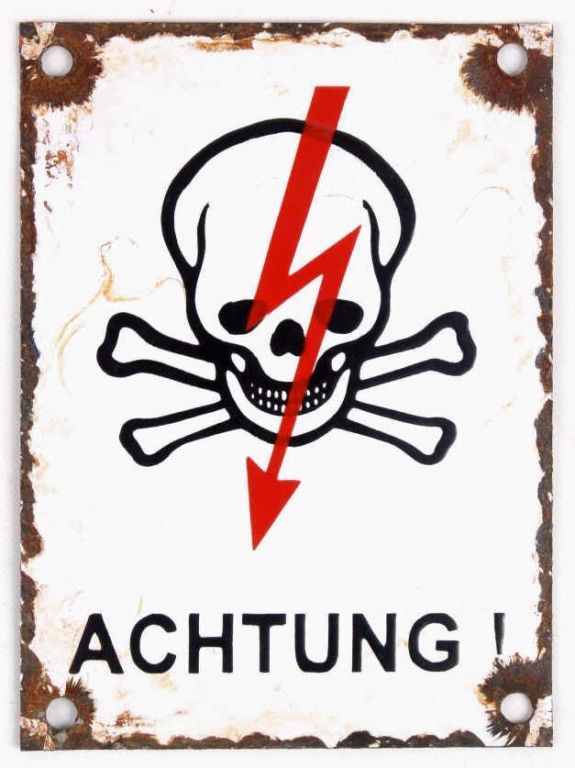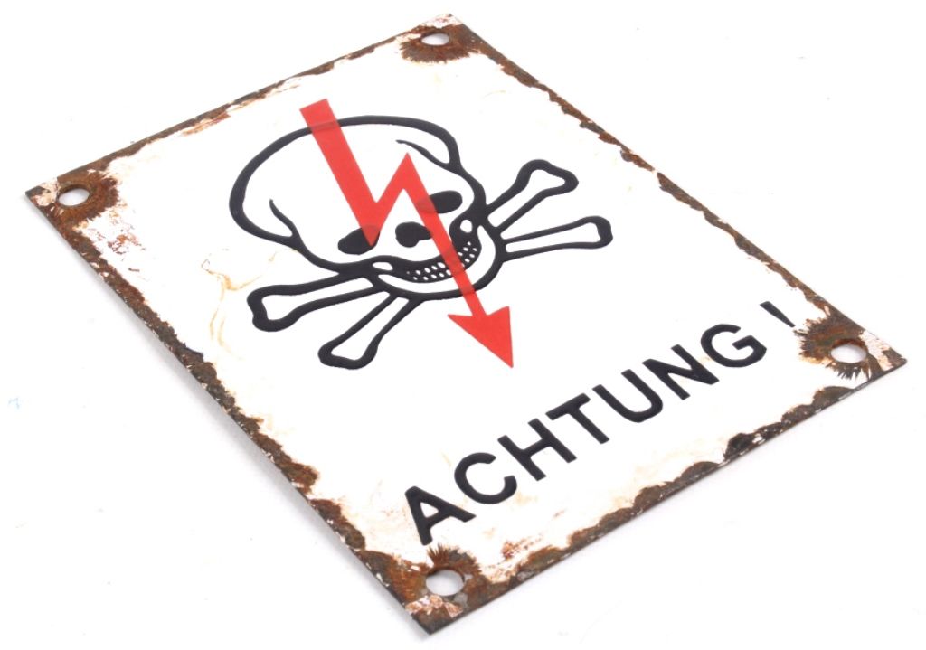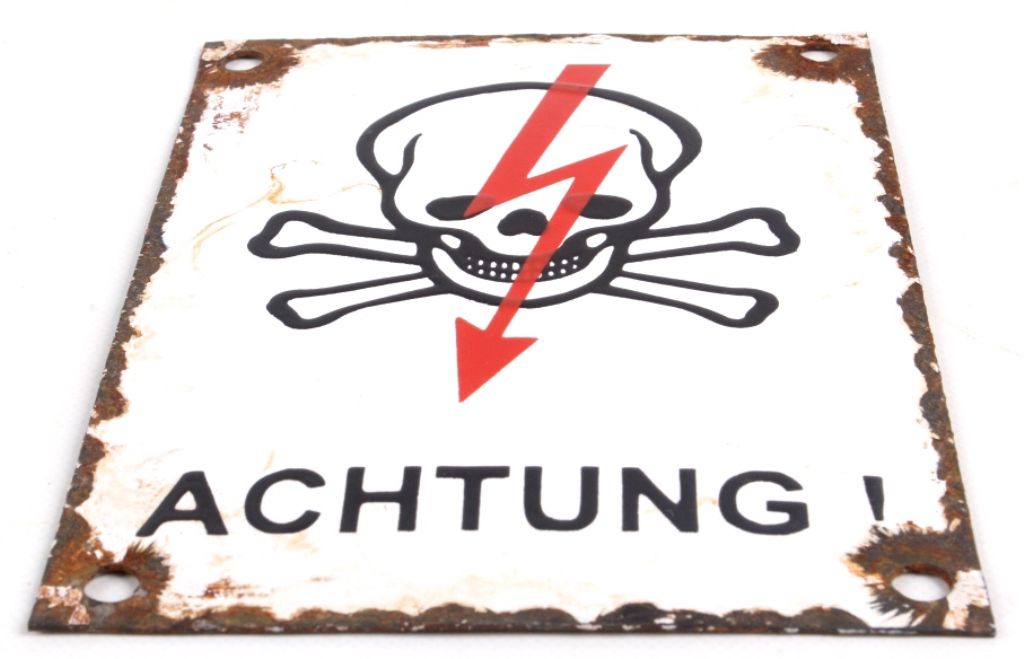 This features a skull and cross bones with a lighting bolt down the center. The sign is 6"x4.5" and has a wonderful cracked edge giving to the patina. This old sign shows a heavy metal construction with a porcelainenamel front.