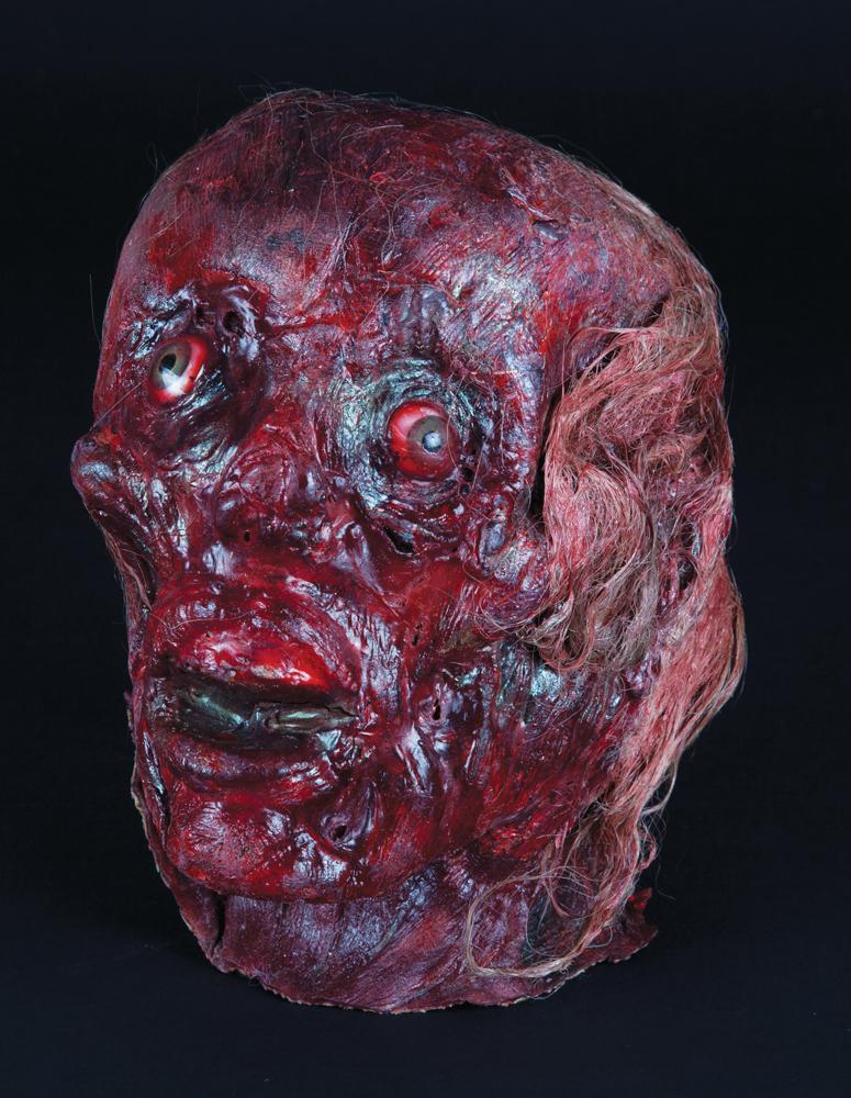 (Fox-TV, 1993-2002) Special effects acid-burned skull from The X-Files episode, "The Pine Bluff Variant.”. Constructed of foam and rubber with plastic eyes, attached faux blood stained hair, and rotting skin made to simulate acid burns.