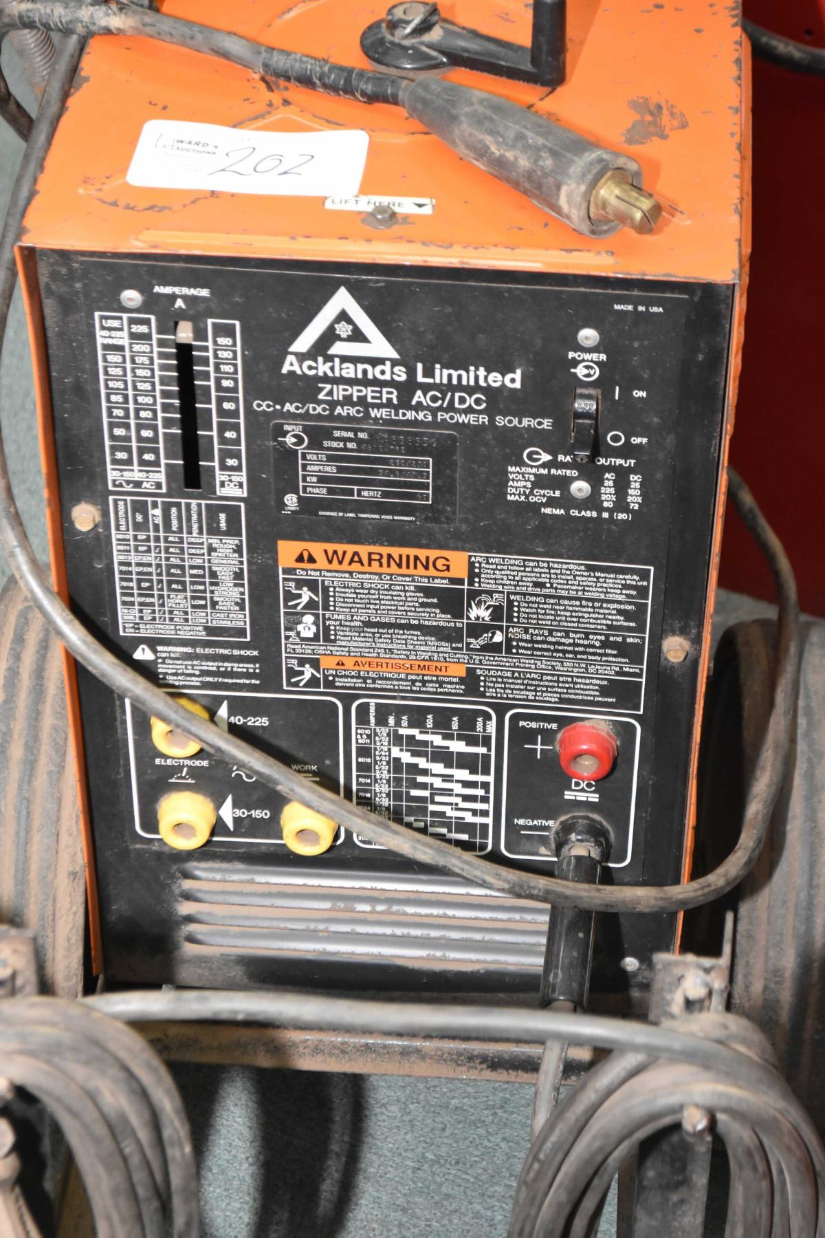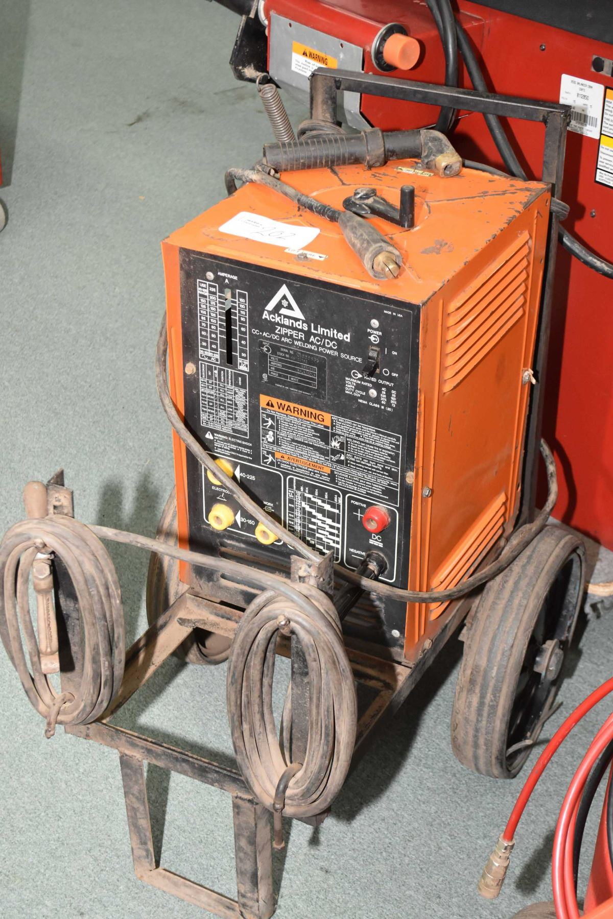 Acklands Ltd. Zipper AC/DC 225 amp, 220 volt arc welder- AUCTION HOUSE WILL NOT PROVIDE SHIPPING FOR THIS ITEM. BUYER MAY ARRANGE THEIR OWN COURIER.