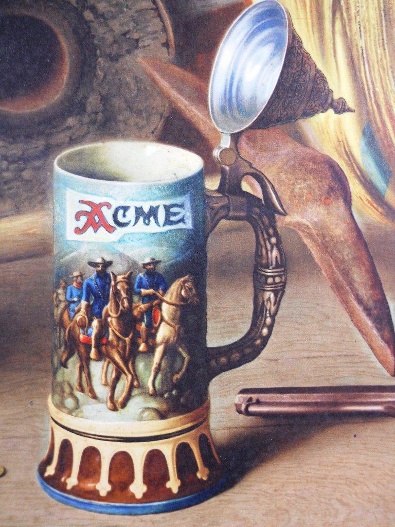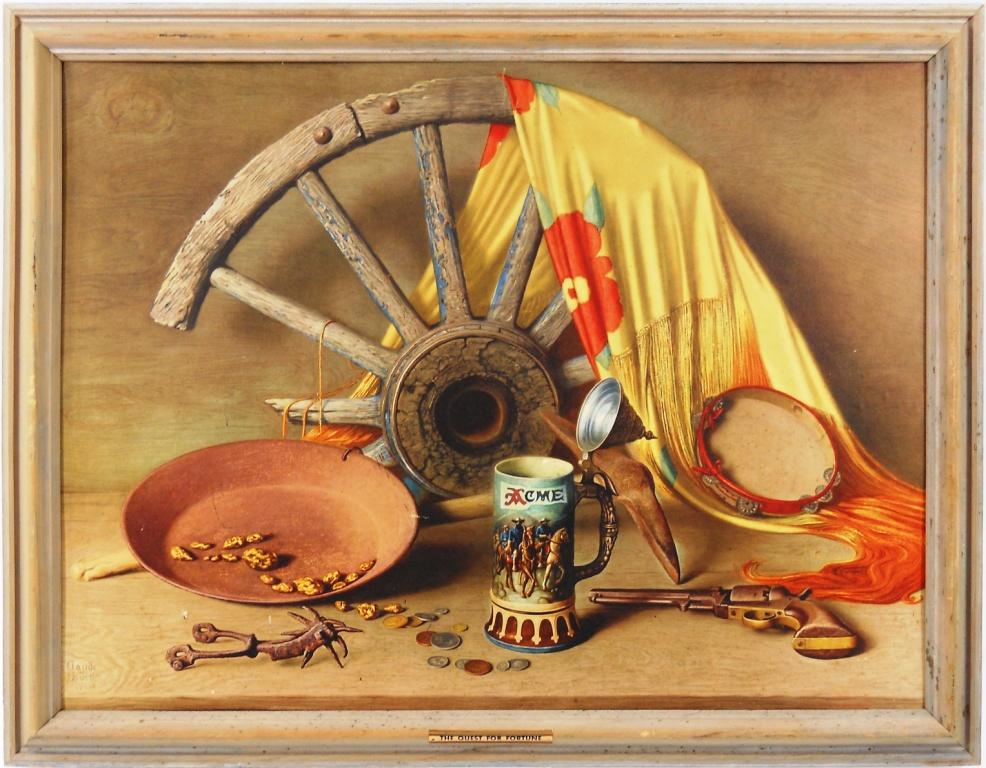 28" x 22". This picture is titled "The Quest for Fortune" and is by Acme Breweries of San Francisco and Los Angeles. It is in the original frame and advertises Acme Beer. This is a classic image that they distributed during the 1940s and '50s. This has great rustic color and a great image, it displays great and is in excellent condition.