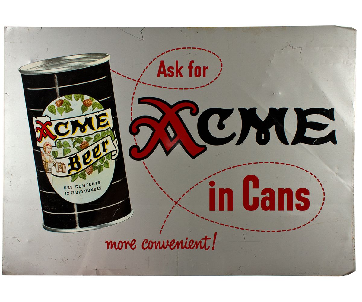 c1940 Based in San Francisco, Acme Beer was one brewery that survived Prohibition. This sign advertises the convenience of drinking the beer from cans and in those days, the cans neither had a pop top or were made from aluminum. This sign measures 24”x 17” and is made from a very thin metal. It’s in good condition with a very few nicks or dents. - HKA#65909