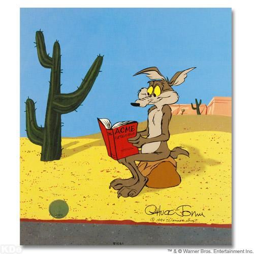 Own this amazing piece based on the original line image hand drawn and hand-inked on paper by Mr. Jones! "Acme Catalogue" is a limited edition animation cel from a sold out edition with hand-painted color on sericel outline, numbered and hand signed by Chuck Jones (1912-2002). The sericel comes with a brilliant full-color background. Includes Certificate of Authenticity! Measures approx. 12.5" x 10.5" (sericel and background).