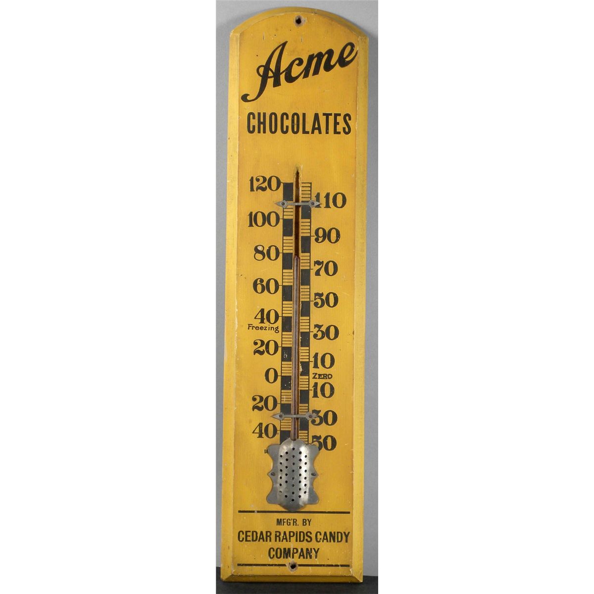 Acme Chocolate Wood Thermometer. Cedar Rapids Candy Company. Excellent condition. 5 1/4 X 21 inches. Start Price $40.