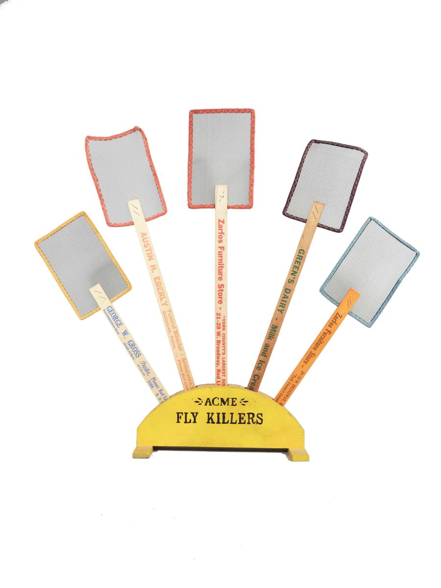 Acme Fly Killer, fly swatter display. Wood with five swatters with advertising on them for five different companies. Excellent condition.
