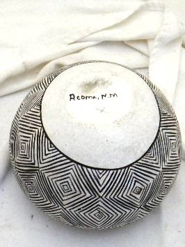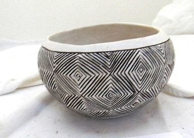 Acoma Bowl with fine lines, black on white. Diameter is approximately 5 inches and three inches deep. This is from about 1950. Shipping $14.50. Painting is similar to Lucy Lewis. Condition is very good