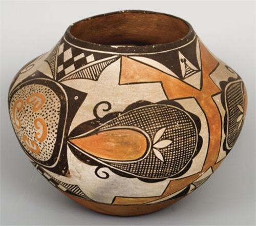 Acoma Bowl. 7" x 8 ½”. Fertility symbol designs. c.1930s. Minor nicks and scrapes. (est $1,200-1,600)