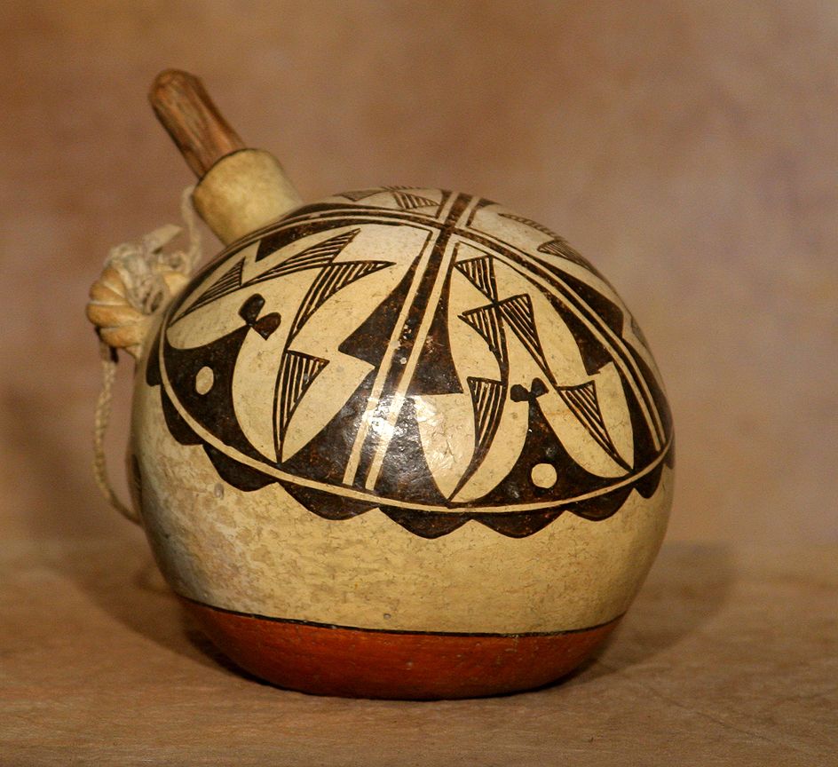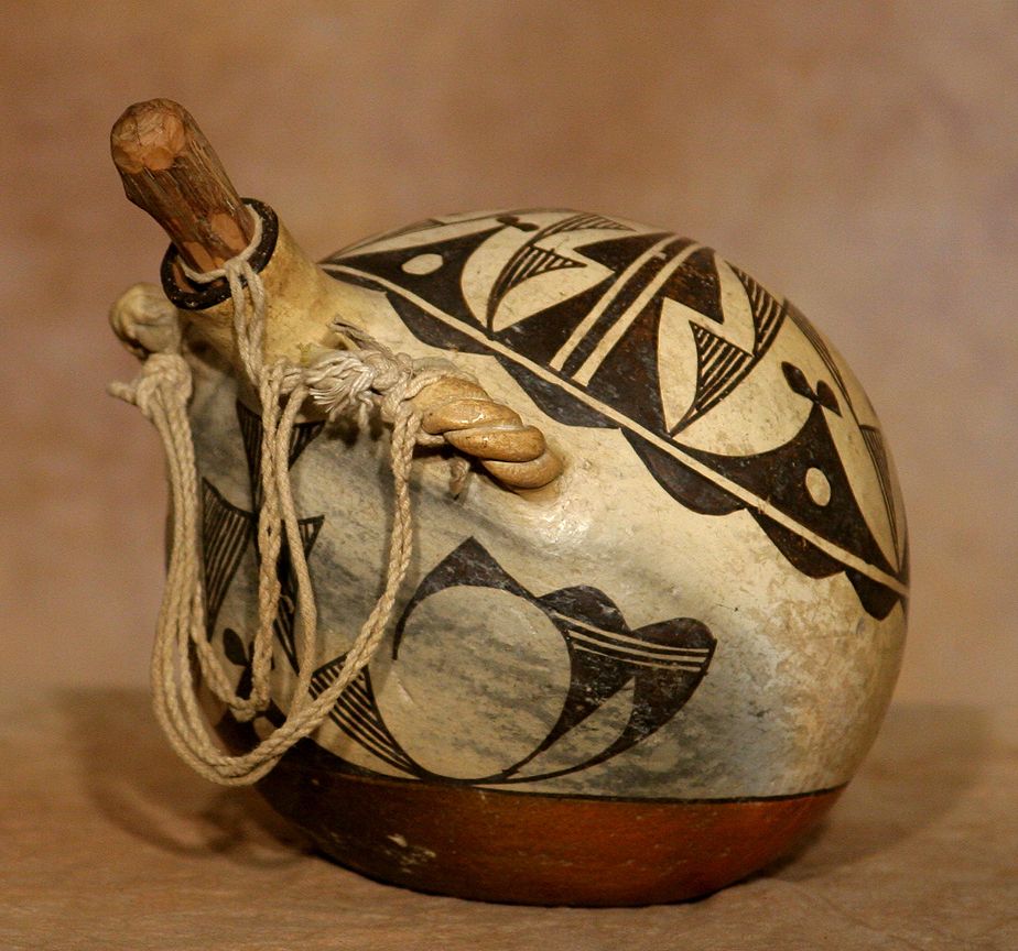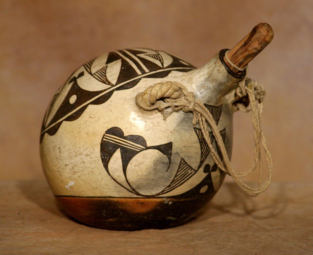 Acoma Canteen. 9" x 6" x 7". White slip with red base and black geometric designs. Twisted handles. Early 1900s. (est. $900-1,200). CONDITION REPORTS: www.auctioninsantafe.com/docs/cr2012.pdf