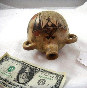 Acoma Canteen which measures 5x5 inches. Canteen shows some paint loss with hair line crack. Circa 1930, Shipping $15.00