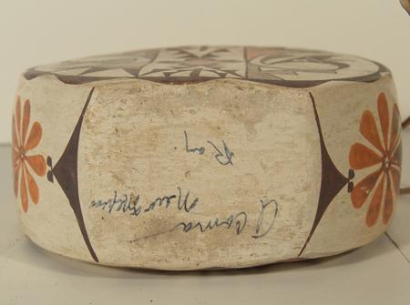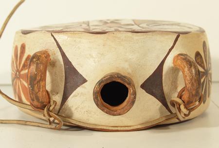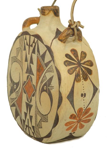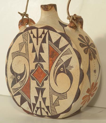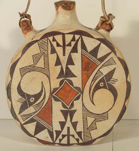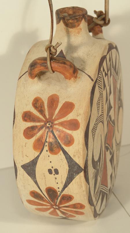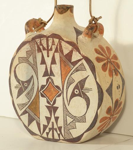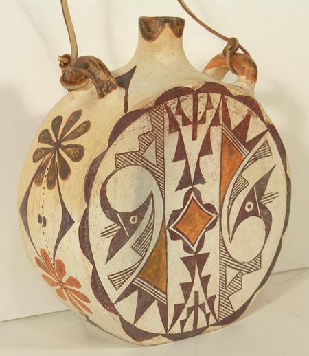 Classic round canteen with deep sides and traditional polychrome parrot forms on both sides. Signed "Acoma, NM Ray". Purchased from Gideons in 1973 for $46.80; appraisal value $3,500. Condition: very good. 8" high x 7" diameter