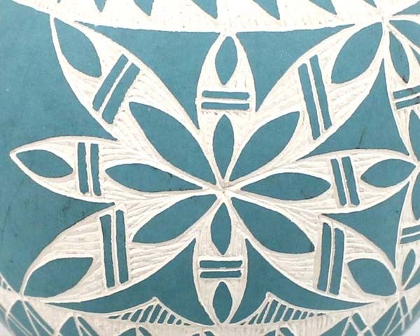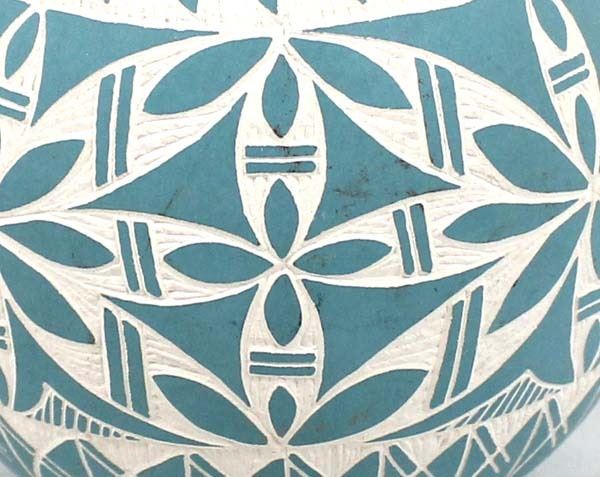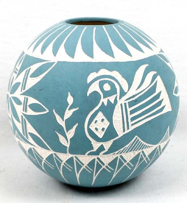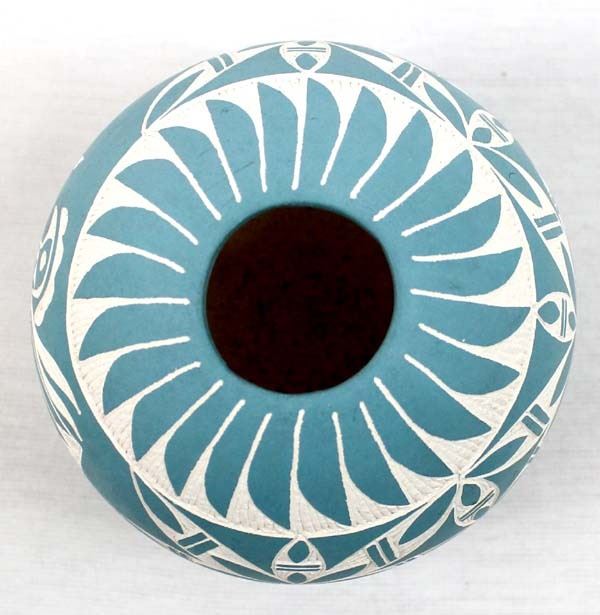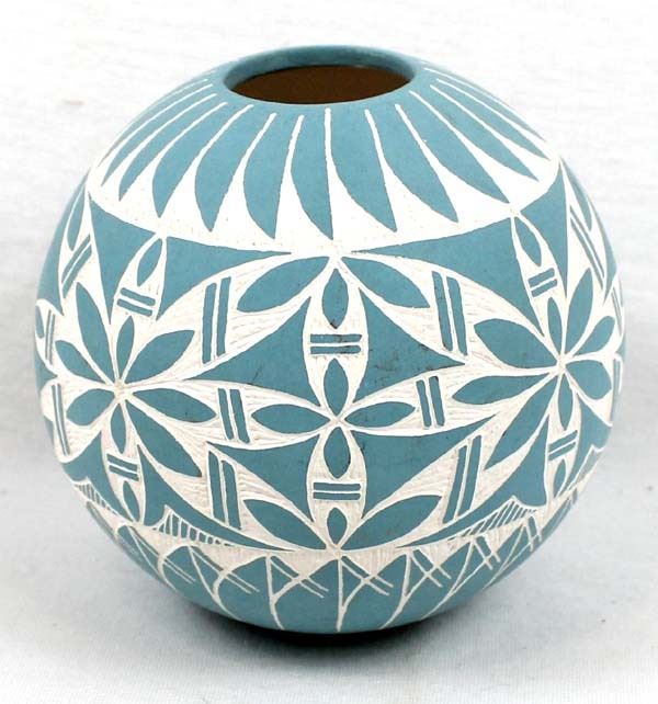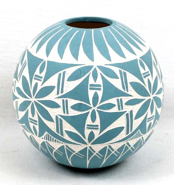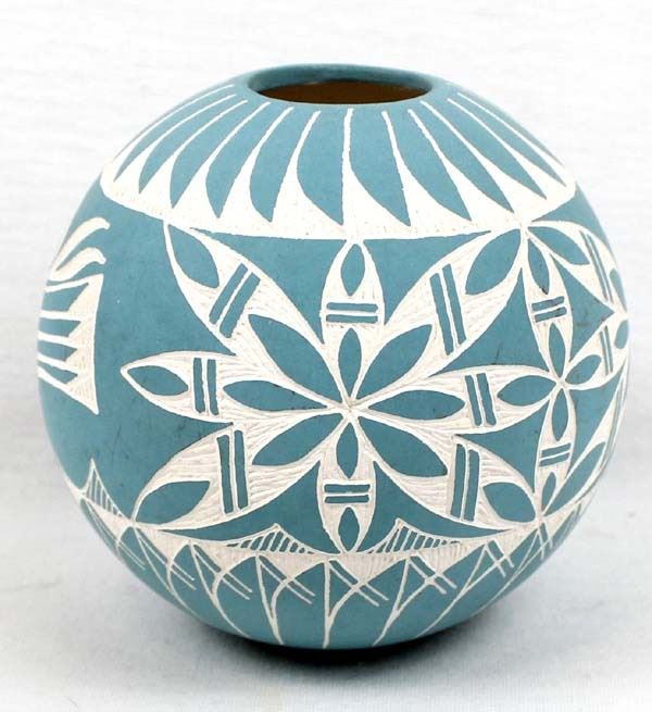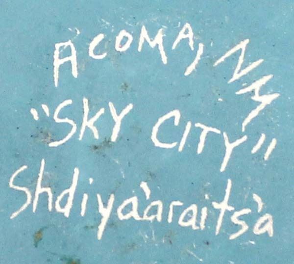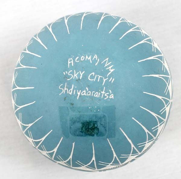 Native American Acoma Sky City Carved Ceramic Pottery Seed Jar by Shdiya'araits'a, measures 4'' x 4'' and is signed on the bottom