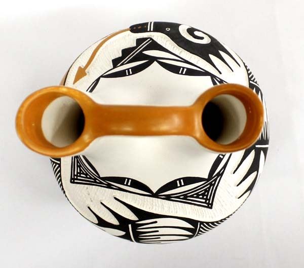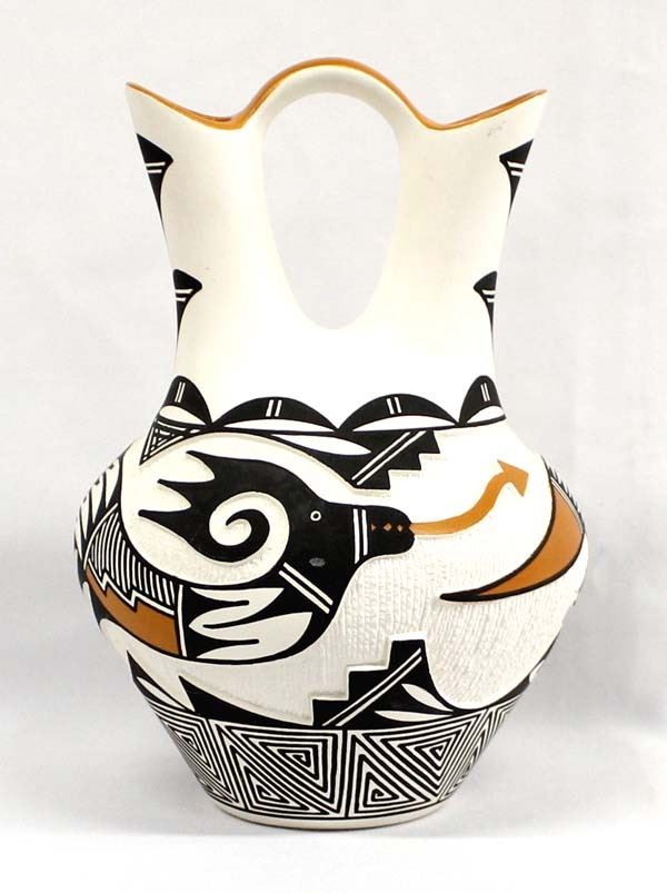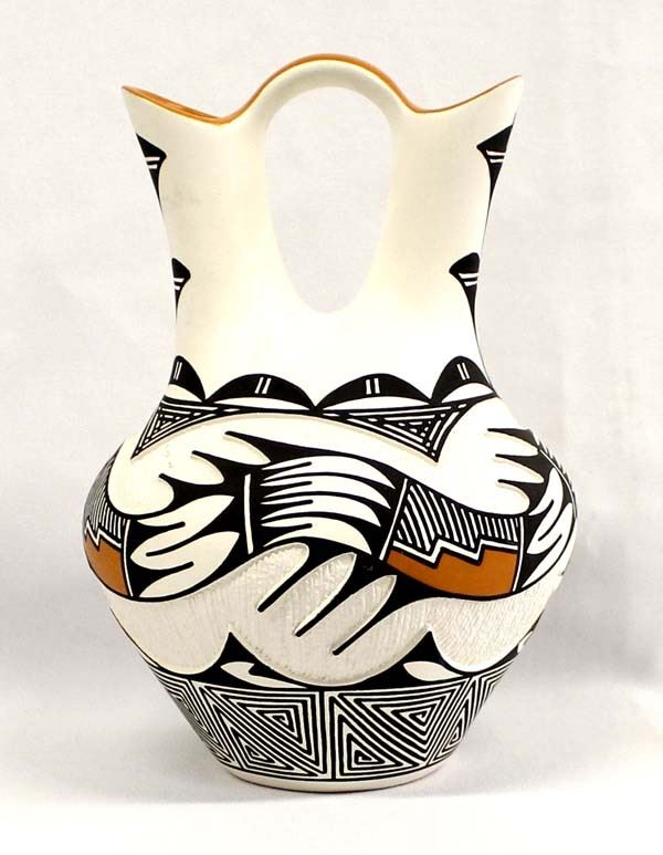 Native American Acoma Carved Ceramic Wedding Vase by Michael Patricio, measures 7'' x 9'' and is signed on the bottom, well executed piece featuring the Avanyu Sea Serpent