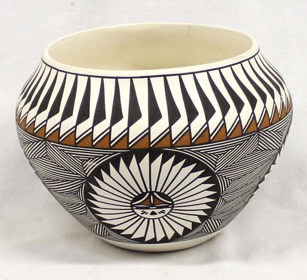 Native American Acoma Ceramic Pottery Bowl by Mike Garcia, measures 6'' x 9'' and is signed on the bottom, beautifully hand painted geometric fine lines and designs and stylized feathers