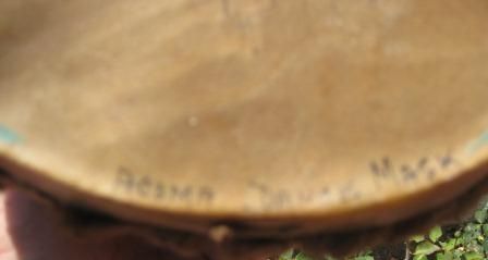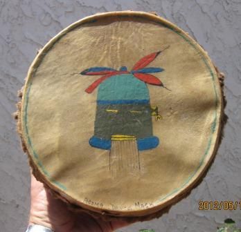 Nine by five inch Acoma drum from New Mexico. Dance mask painted on the drum head. Circa 1930. Good condition. Shipping $20.00