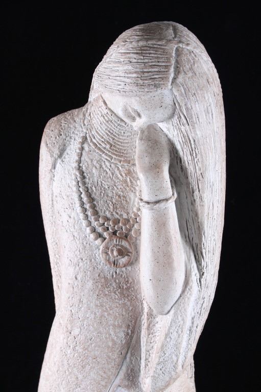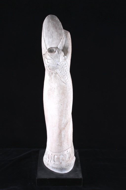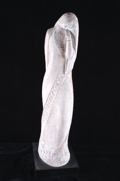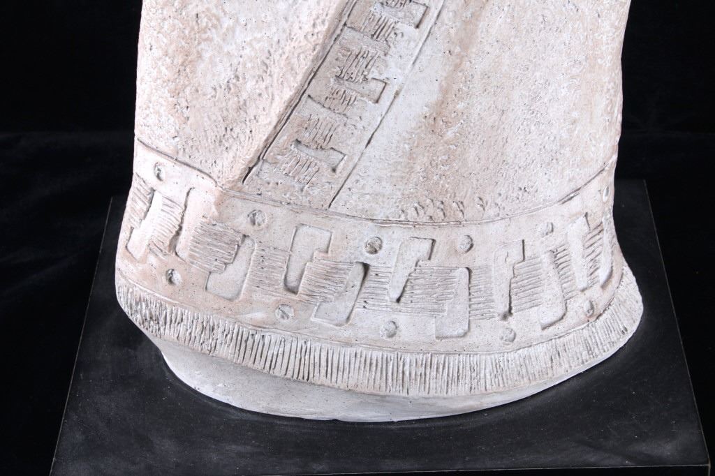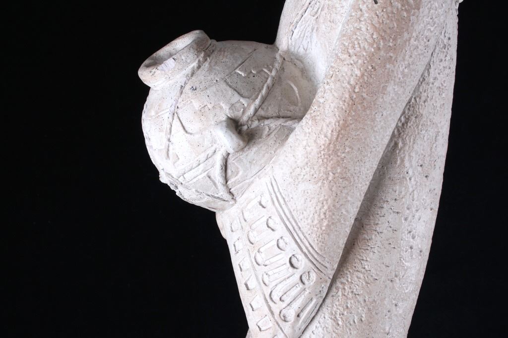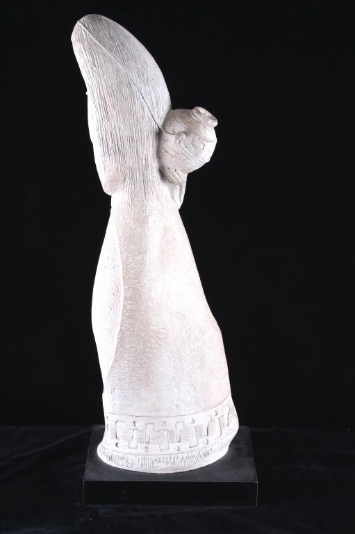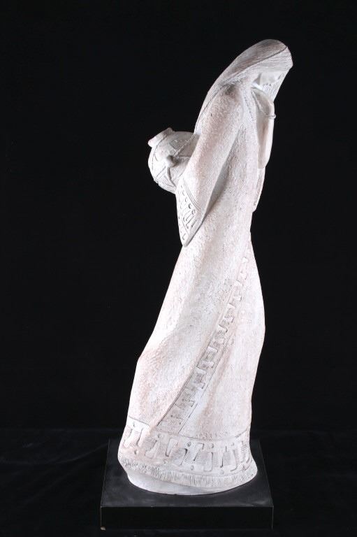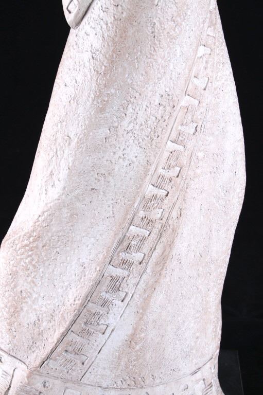 Featured in this lot is an Acoma Esperanza Plaster of Paris by Austin Productions, circa 1989. The sculpture features a wonderfully and professionally crafted Plaster of Paris construction that shows Acoma Esperanza carrying a ceramic pottery vessel wearing traditional Acoma garments with a long flowing dress and wearing two necklaces; her facial features are life like and great texturing to her hair. The sculpture is marked on the back as follows: Acoma - Austin Productions - IMC 1989. The condition of this sculpture is well preserved with a small chip to the lid of the vessel she is carrying but otherwise shows well preserved condition. The measurements of this Plaster of Paris sculpture are 33 3/4" x 12 1/2" x 9 1/2". The collective weight of this sculpture is 25lb 8oz.*