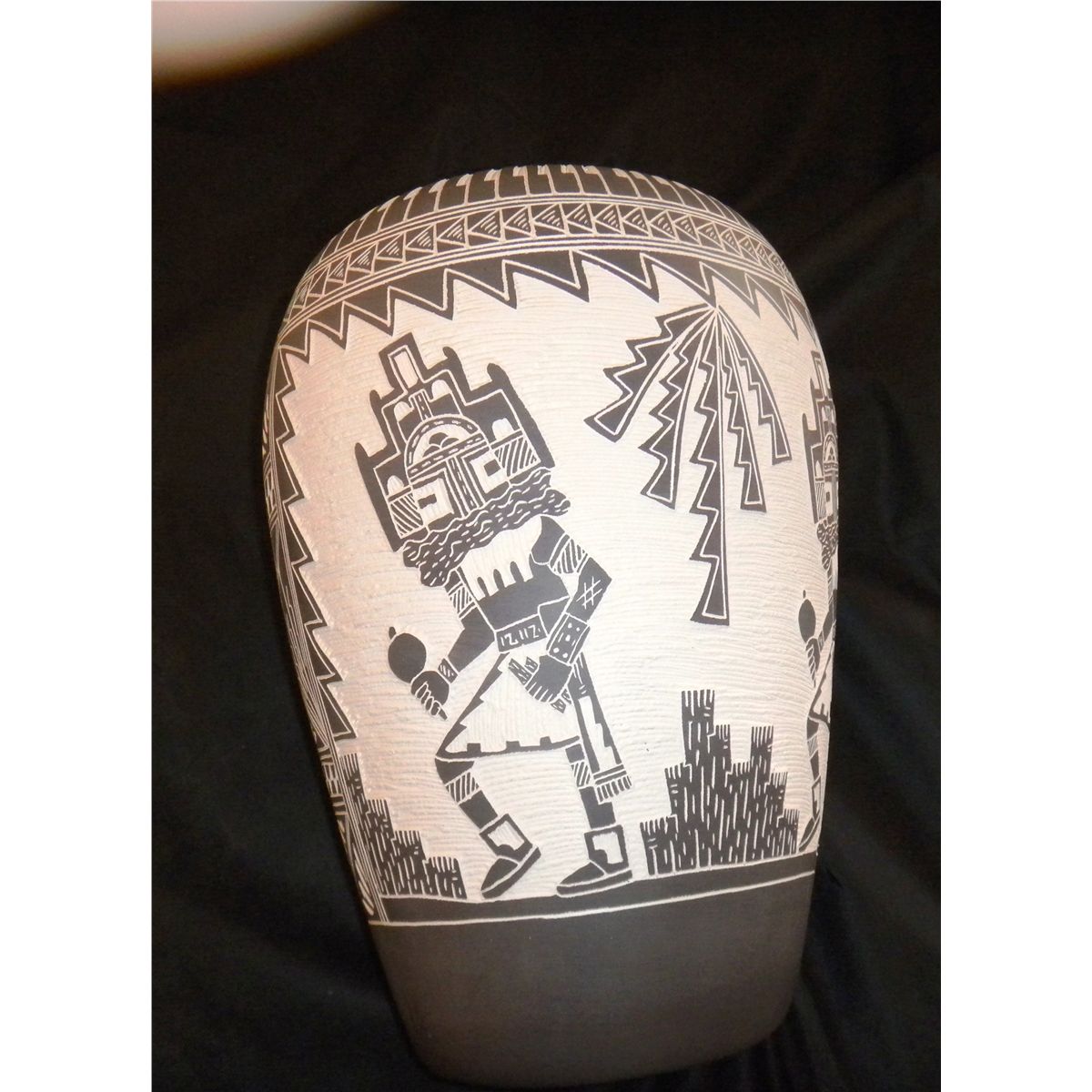 Acoma Figured Olla with Carved Kachina Dancers Measures 15"x 10"- 1980's, Fine Condition, No Restoration or fading. This signed M&R Romero Shipping $35.00