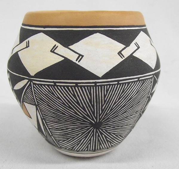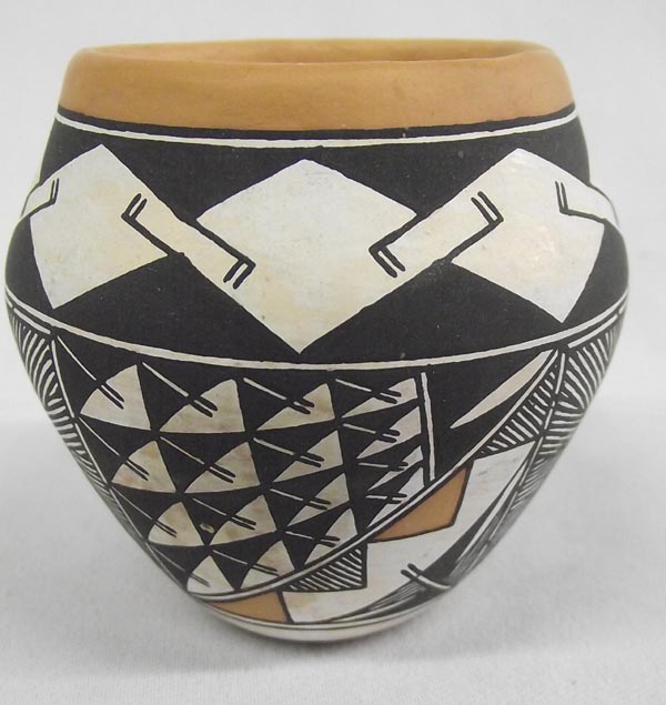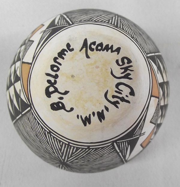 Native American Acoma Fine Line Miniature Pottery By B. Delorme. Measures approx. 2''H x 2 1/4''W. Buyers Pay Actual Shipping and Handling Charges(see terms and conditions for more information).