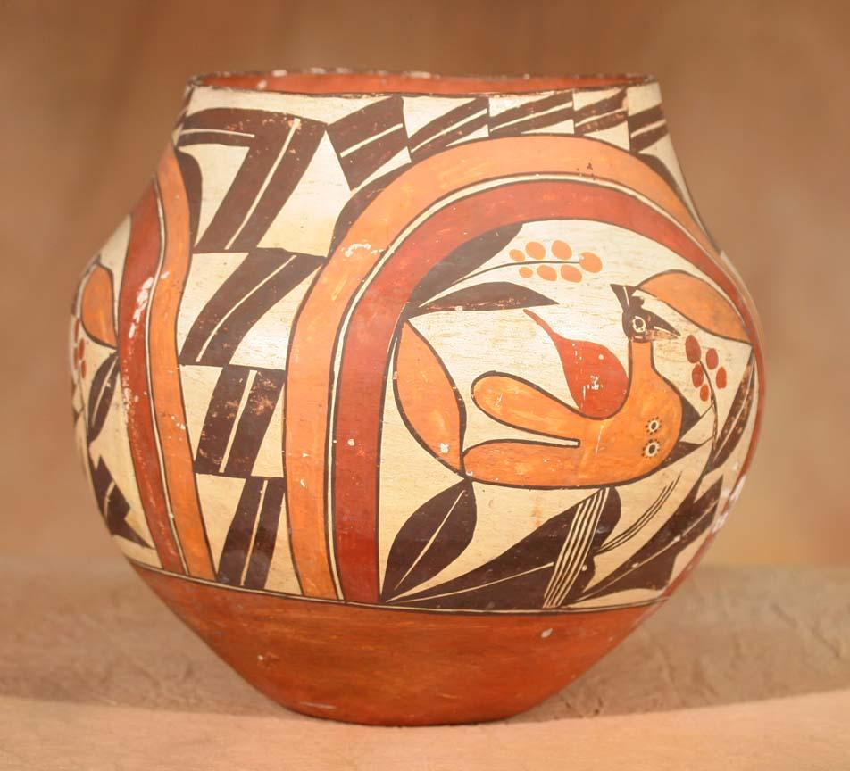 Acoma Four-Color Bird Jar. 11" x 9 ½". Featuring rainbow arches, split diagonals and birds eating berries. Circa 1890. (est $5,000-8,000). Provenance: Bethany College, Lindsborg, KS. For condition reports please visit: www.auctioninsantafe.com/cr2011.pdf