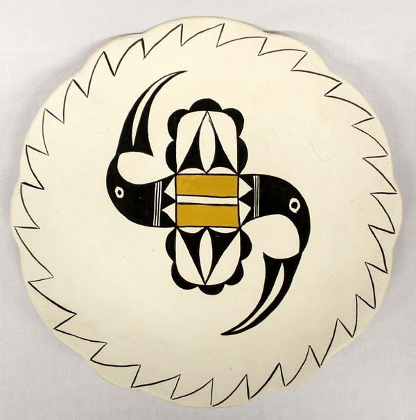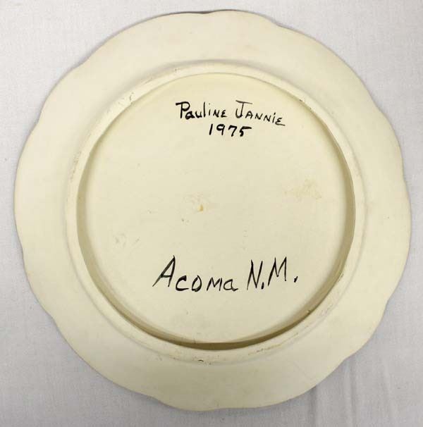 1975 Native American Acoma Hand Painted Ceramic Plate by Pauline Jannie, measures 1.5''H x 12''D, signed on the back
