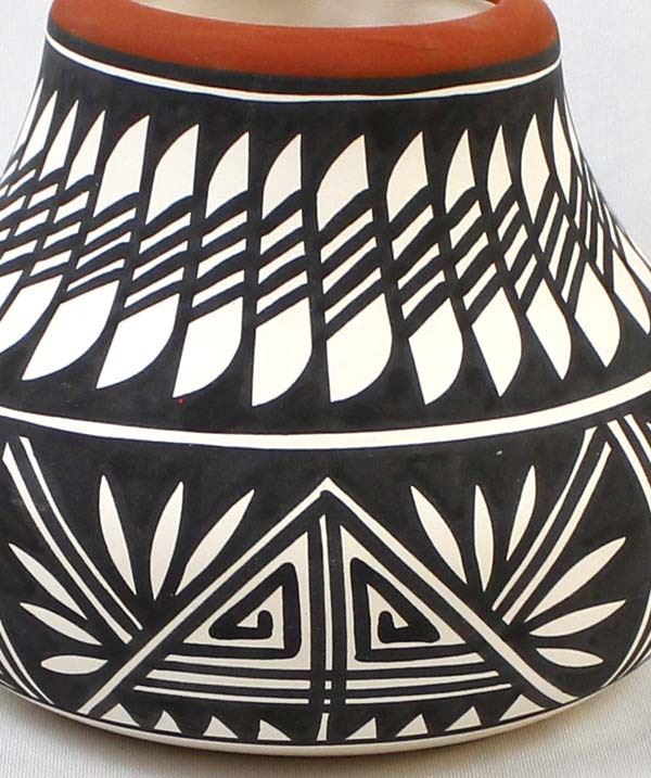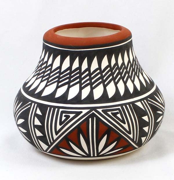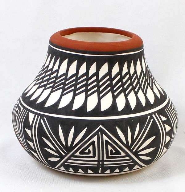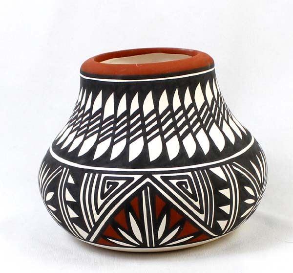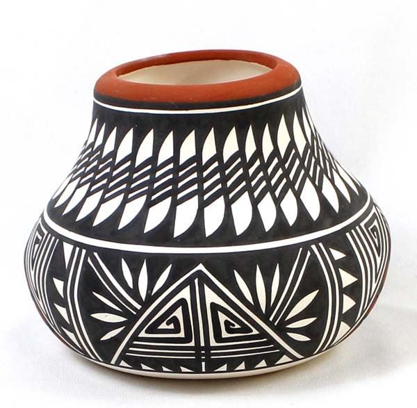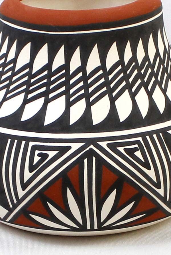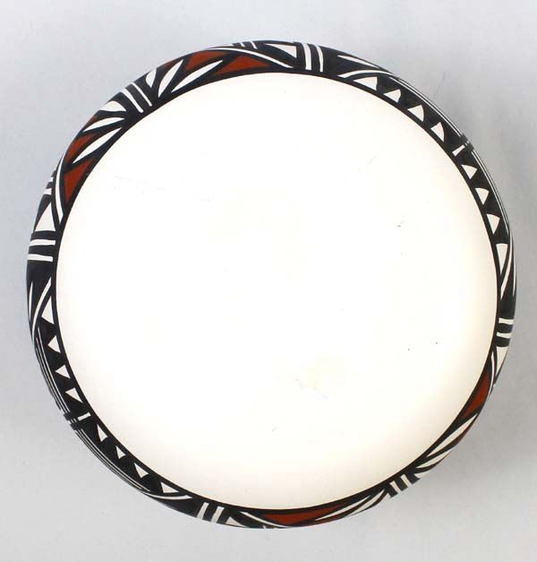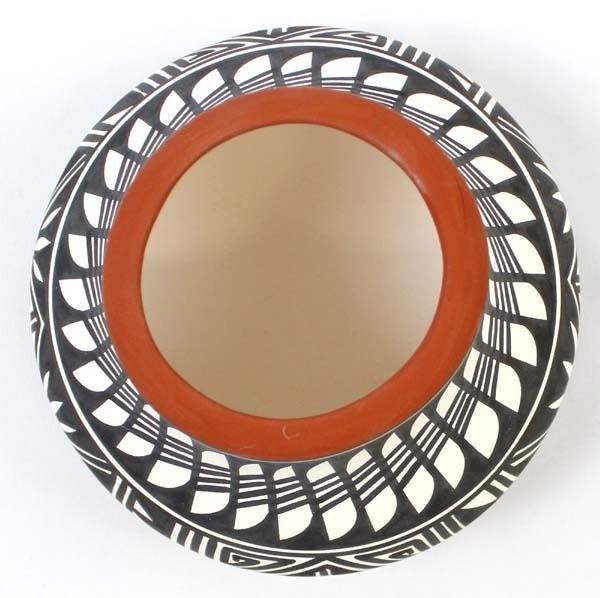 Native American Acoma Hand Painted Ceramic Pottery Bowl, measures 5'' x 7'' and has initial W on the bottom, beautiful traditional stylized feather designs