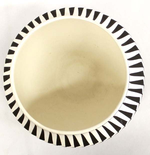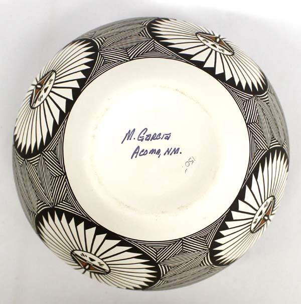 Native American Acoma Hand Painted Ceramic Pottery Jar by M. Garcia, measures 6'' x 8.5'' and is signed on the bottom, crisp fine lines and Sun Face designs along with stylized feathers, Truly a work of art!