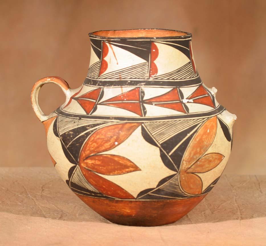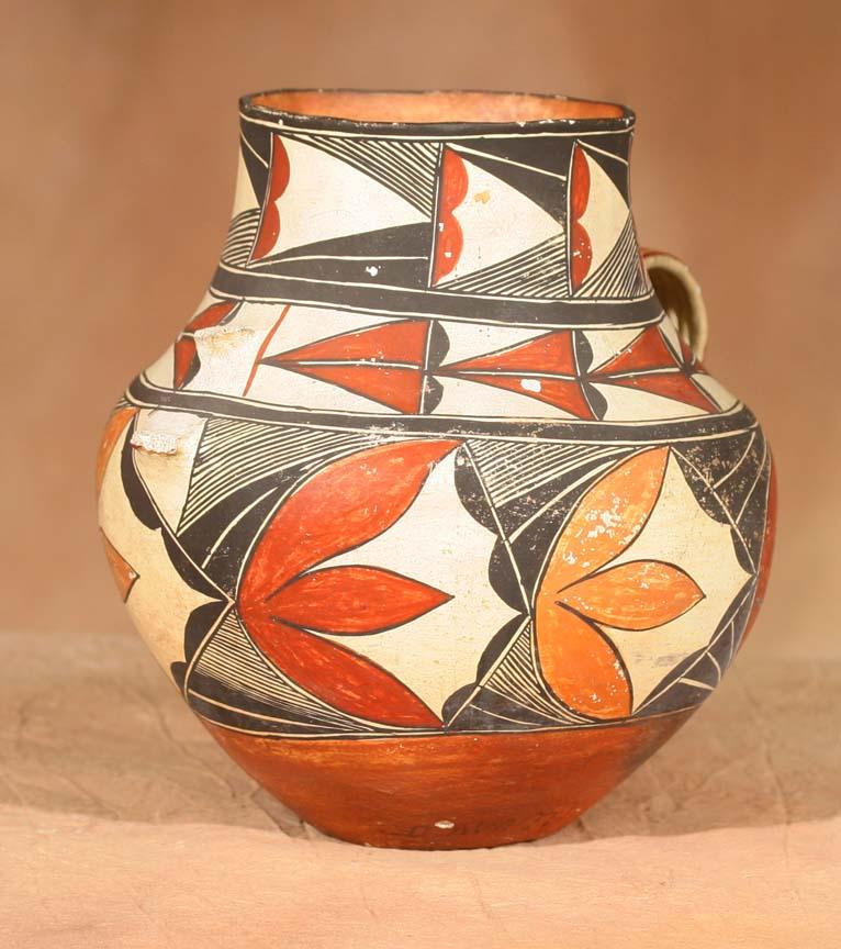 Acoma Handled Vase. 9" x 9". Polychrome featuring abstract floral and bird designs. Circa 1890. One handle broken off. (est $1,500-2,500). Provenance: Bethany College, Lindsborg, KS. For condition reports please visit: www.auctioninsantafe.com/cr2011.pdf