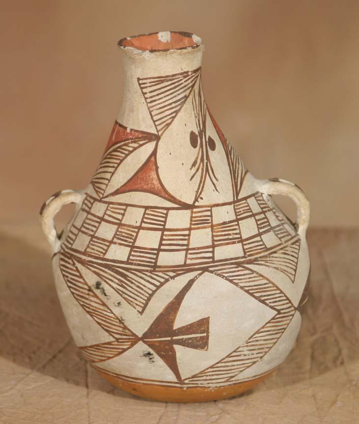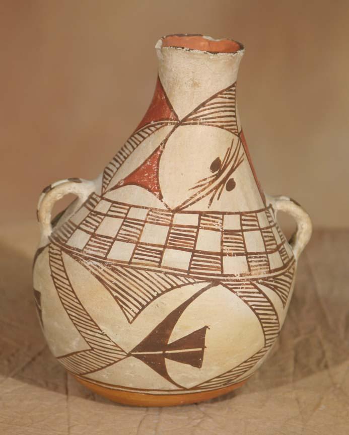 Acoma Handled Vase. 6 ¾" x 5". Polychrome designs-checkerboard pattern with birds in flight, florals and hatching. Circa 1900. (est $400-700). Provenance: Bethany College, Lindsborg, KS. . For condition reports please visit: www.auctioninsantafe.com/cr2011.pdf