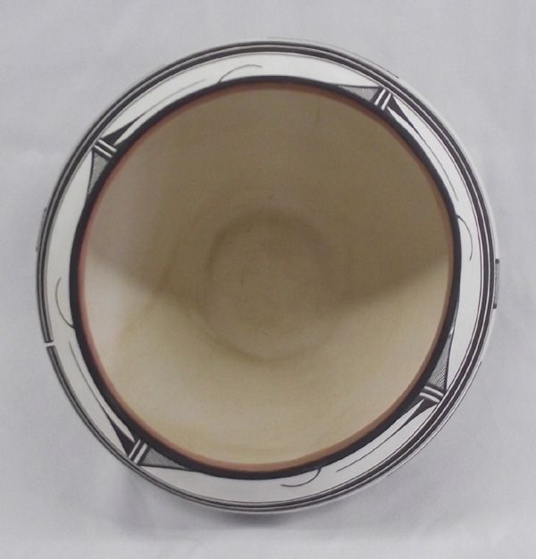 Acoma Parrot Olla - A. Vallo. This is a large, striking Acoma olla with hummingbird head, feather and black line designs. It is signed on the bottom, ''A. Vallo Acoma.'' It measures 8.5''H x 7.5''W.