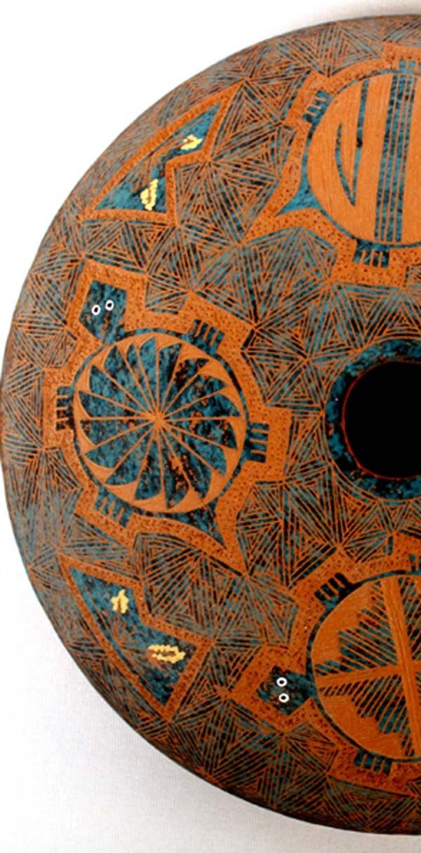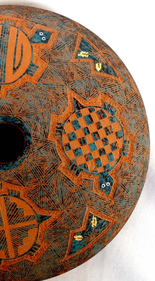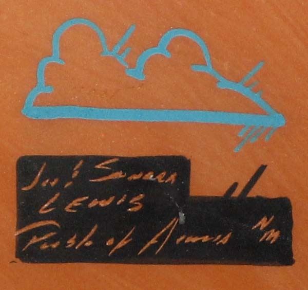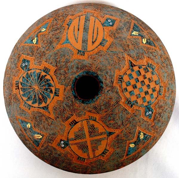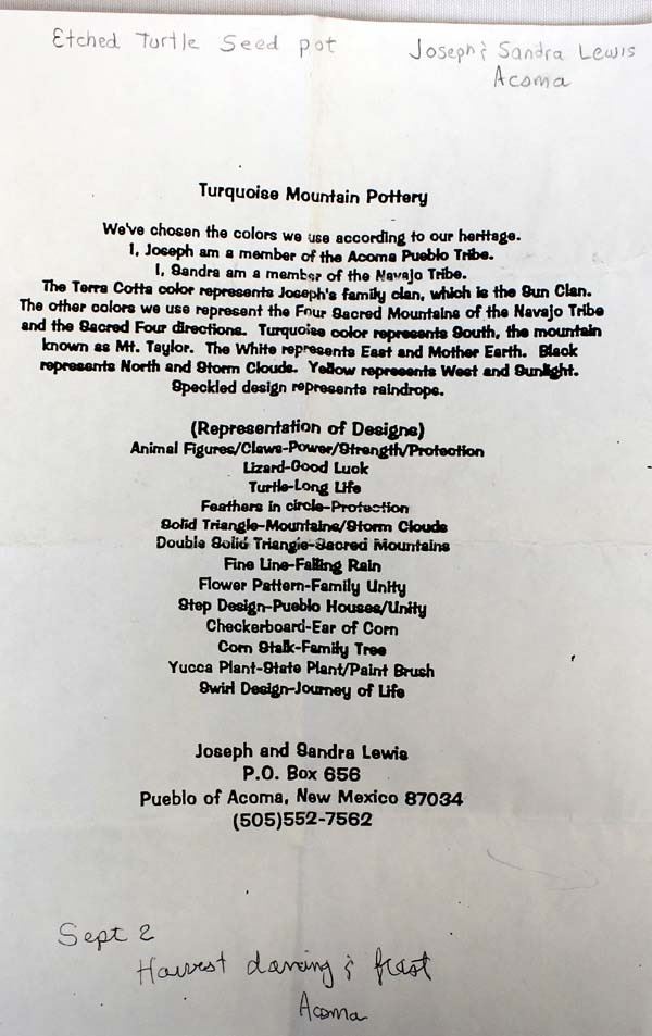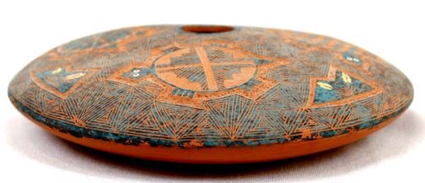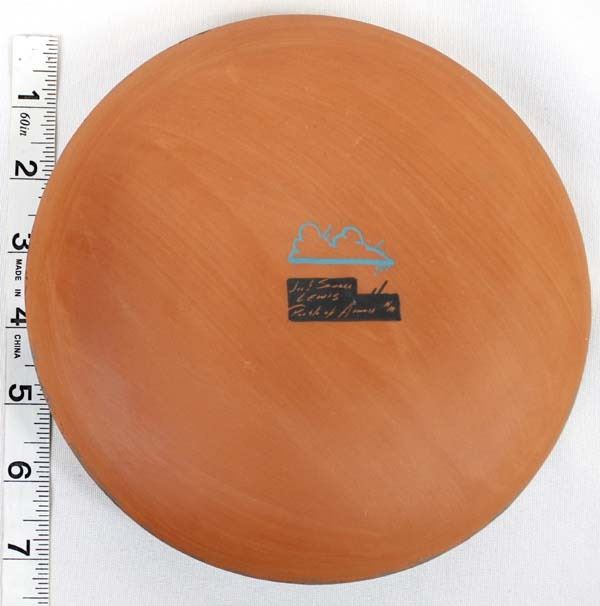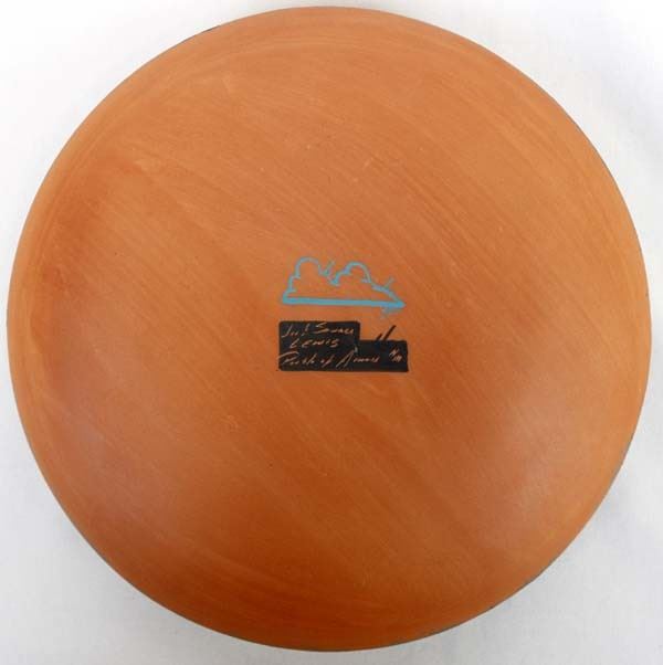 Native American Acoma/Navajo Incised Pottery Seed Jar by Sandra & Joseph Lewis (Turquoise Mountain Pottery), measures 7.5''D x 1''H and is signed on the bottom, stunning colors, incised turtle motif which represent long life, FYI: ''We've chosen the colors we use according to our heritage. I, Joseph am a member of the Acoma Pueblo Tribe. I, Sandra am a member of the Navajo Tribe. The Terra Cotta color represents Joseph family clan, which is the Sun Clan. The other colors we use represent the Four Sacred Mountains of the Navajo Tribe and the Sacred Four Directions. Turquoise color represents South, the mountain known as Mt. Taylor. The white represents EAst and Mother Earth. Black represents North and Storm Couds. Yellow represents West and Sunlight. Speckled design represents raindrops.''