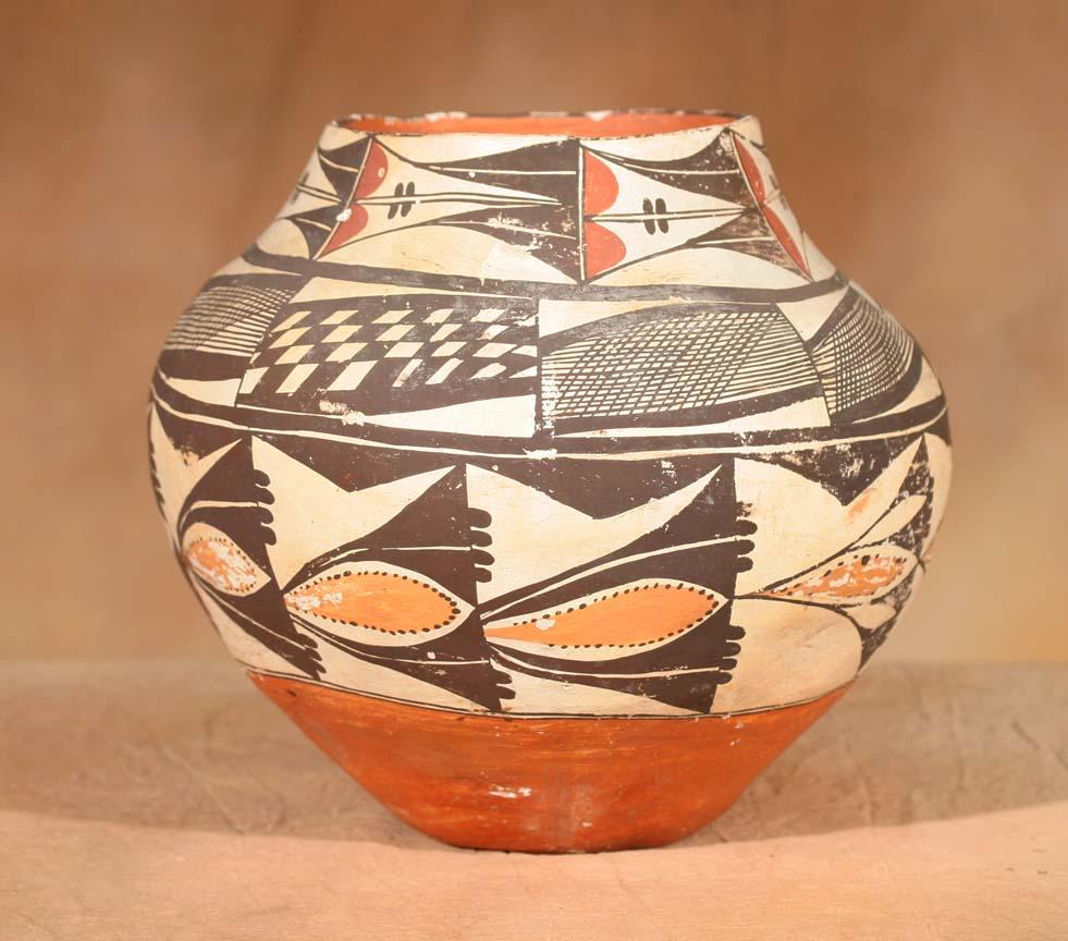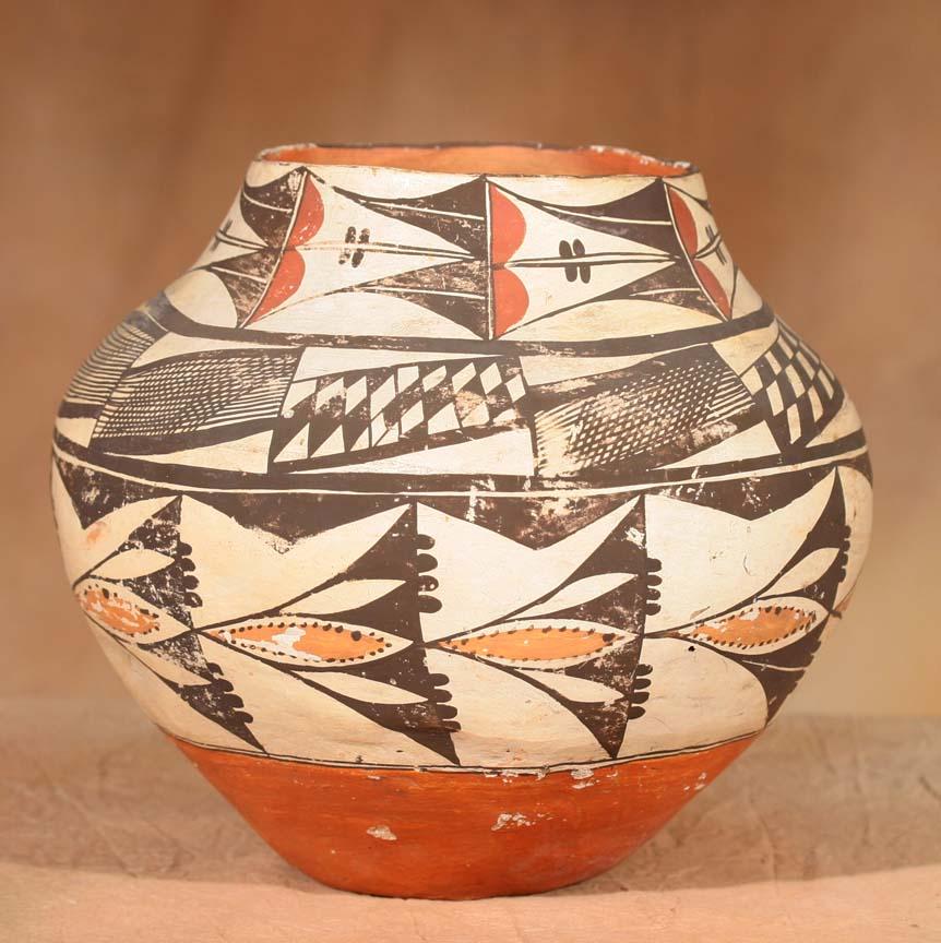 Acoma Jar. 10 ¼" x 9 ½". Four-color jar with a mixture of abstract designs. Circa 1890-1900. (est $2,000-3,000). Provenance: Bethany College, Lindsborg, KS. For condition reports please visit: www.auctioninsantafe.com/cr2011.pdf