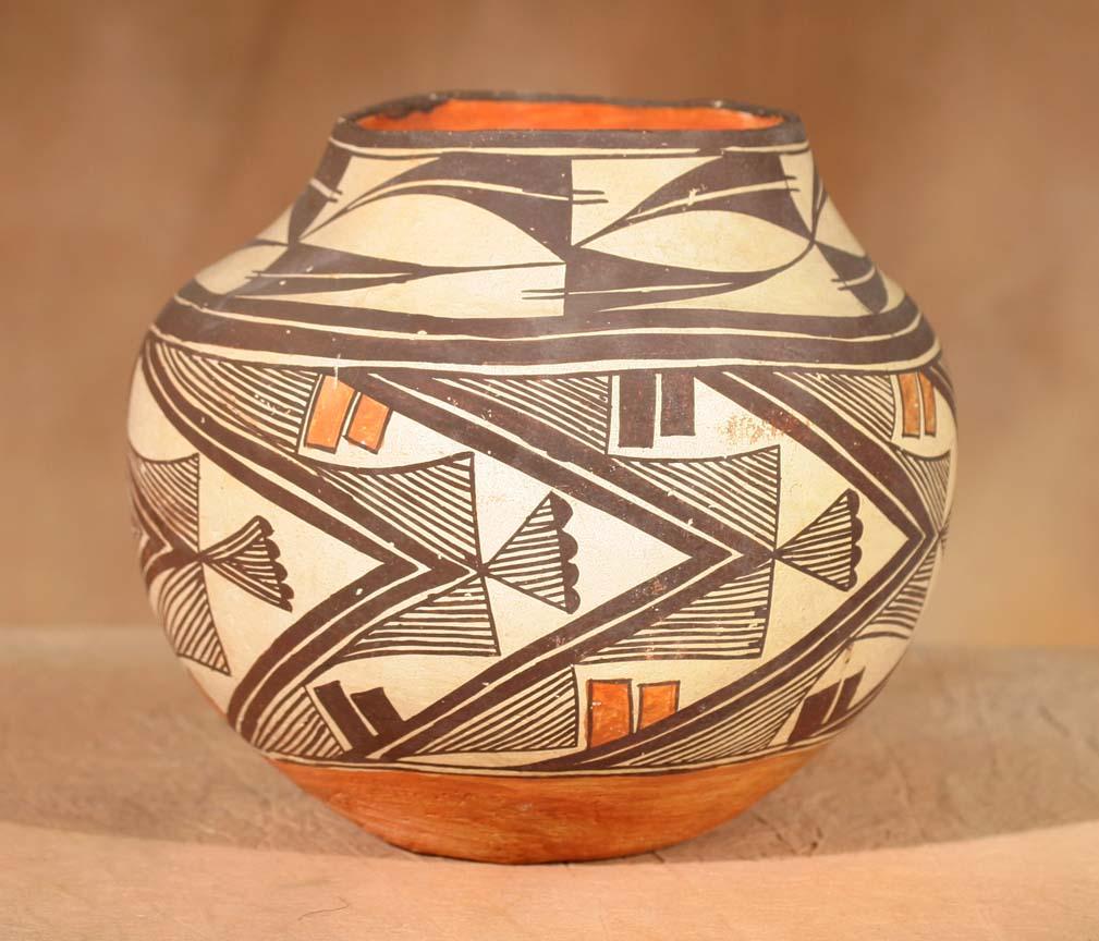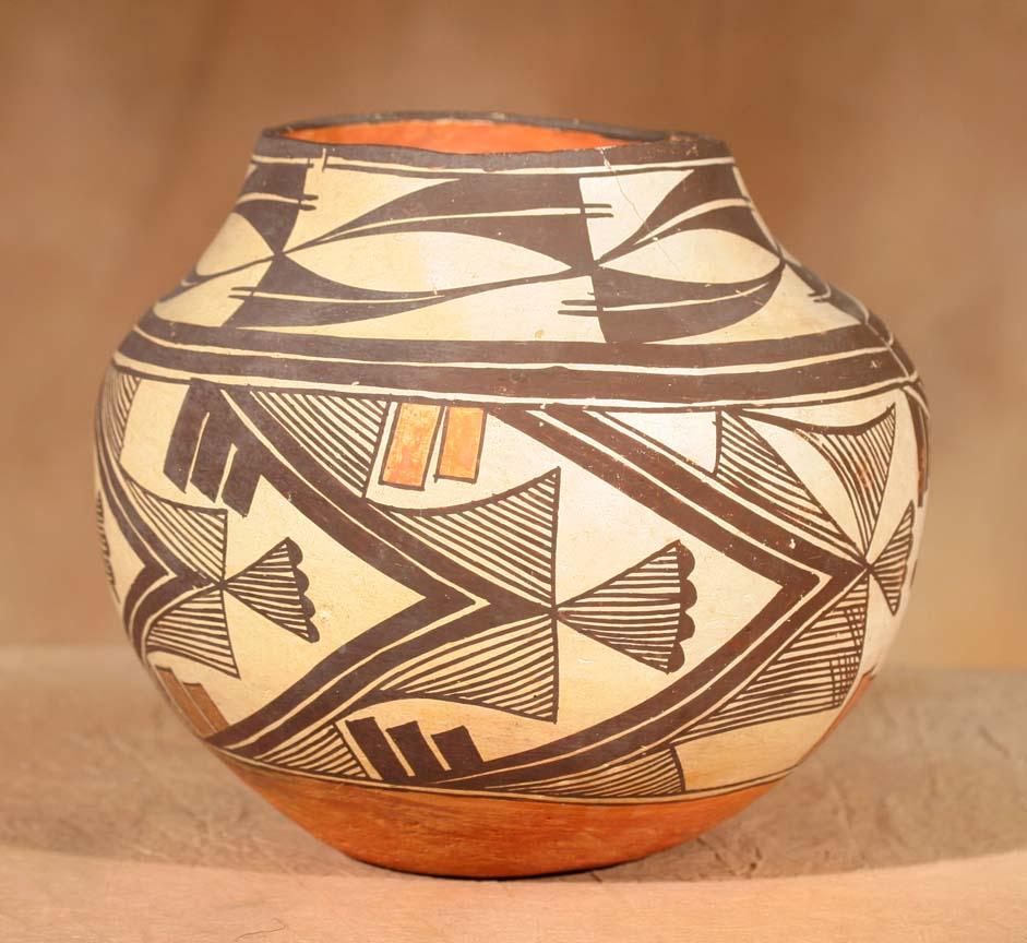 Acoma Jar. 9 ½" x 9 ¾". Polychrome. Circa 1900. (est $1,500-3,000). Provenance: Bethany College, Lindsborg, KS. For condition reports please visit: www.auctioninsantafe.com/cr2011.pdf