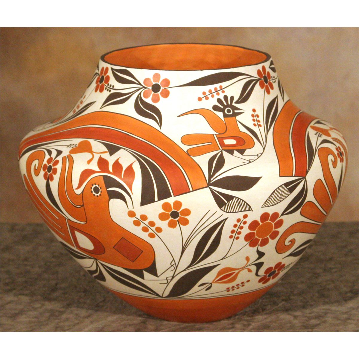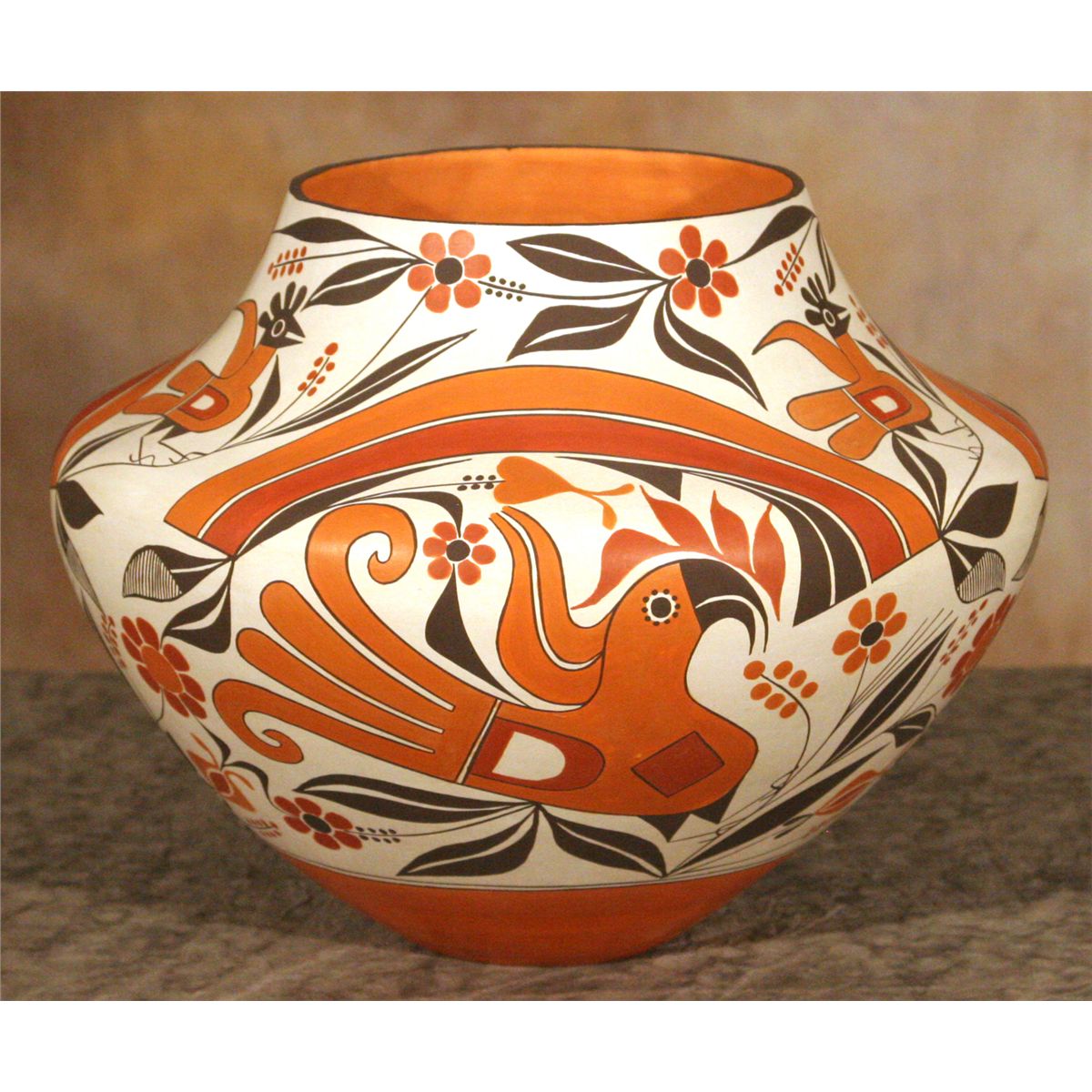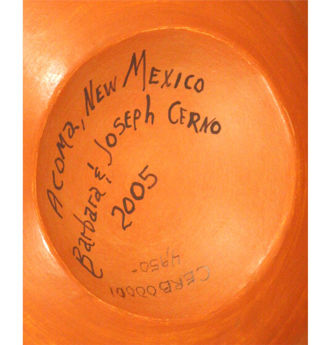 Acoma Jar by Barbara Cerno (1951 - ) and Joseph Cerno (1947 - ). 10" x 13". Large jar in a classic polychrome bird and floral design. Signed: ACOMA, NEW MEXICO, BARBARA and JOSEPH CERNO, 2006.