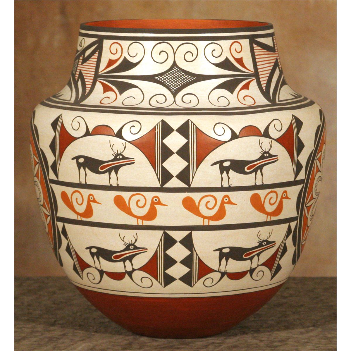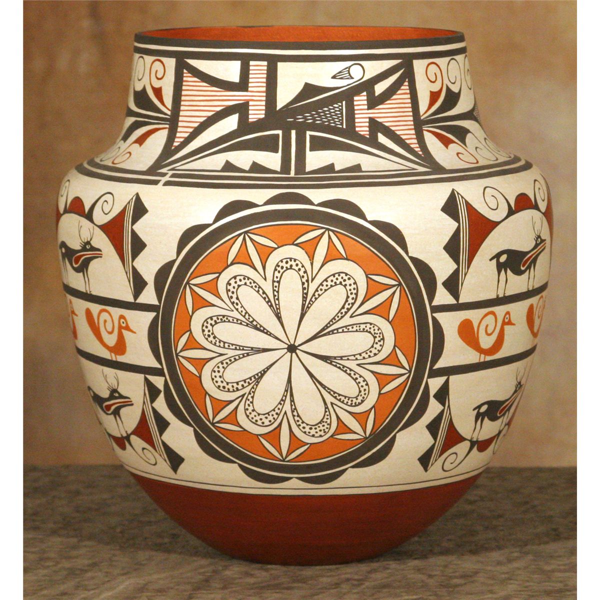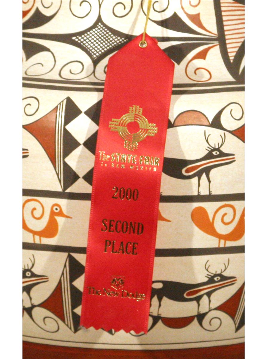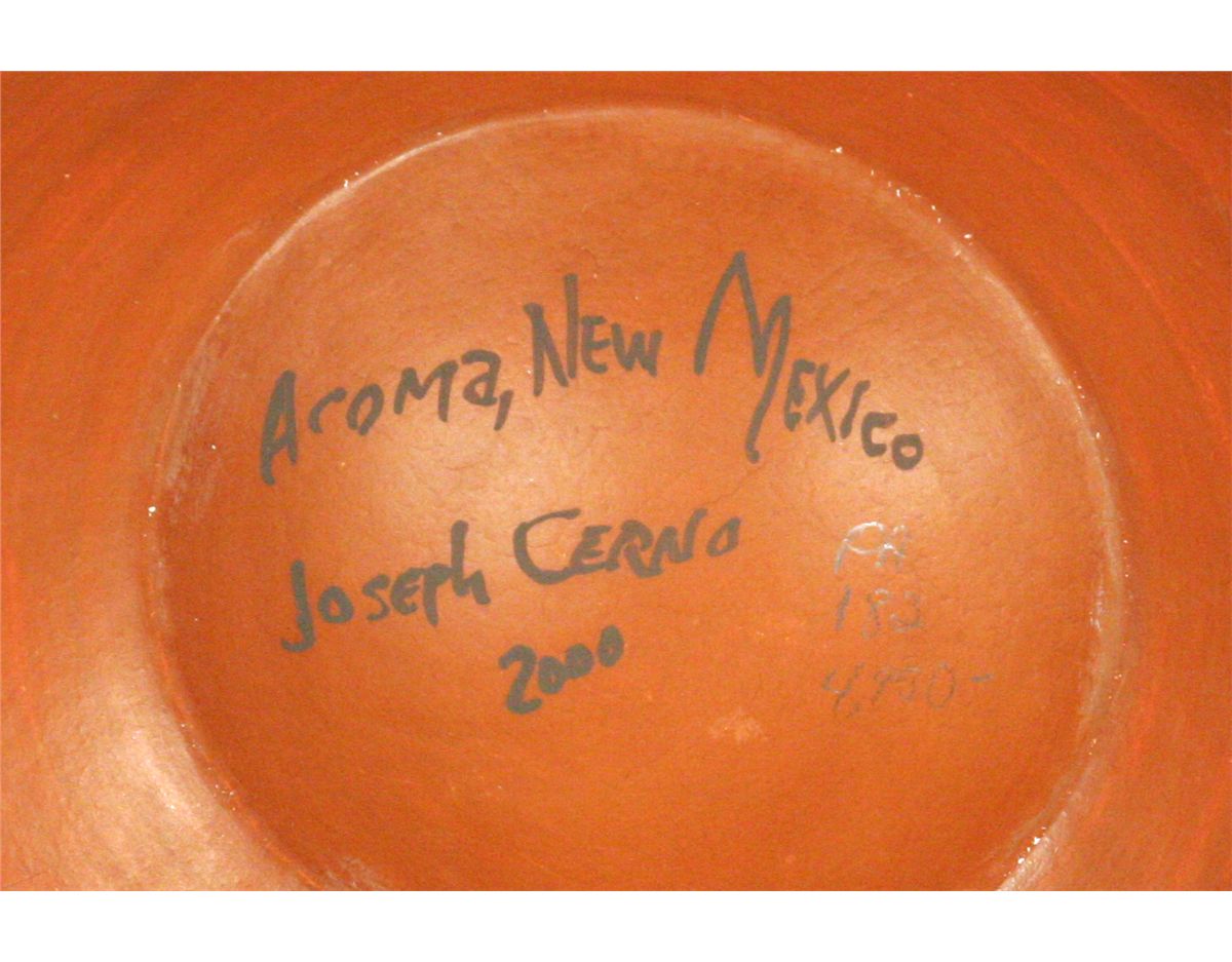 Acoma Jar by Joseph Cerno (1947 - ). 14" x 13". Fine, detailed polychrome painting. Award winner at the 2000 New Mexico State Fair (ribbon included). Signed: Acoma, New Mexico, Joseph Cerno, 2000.