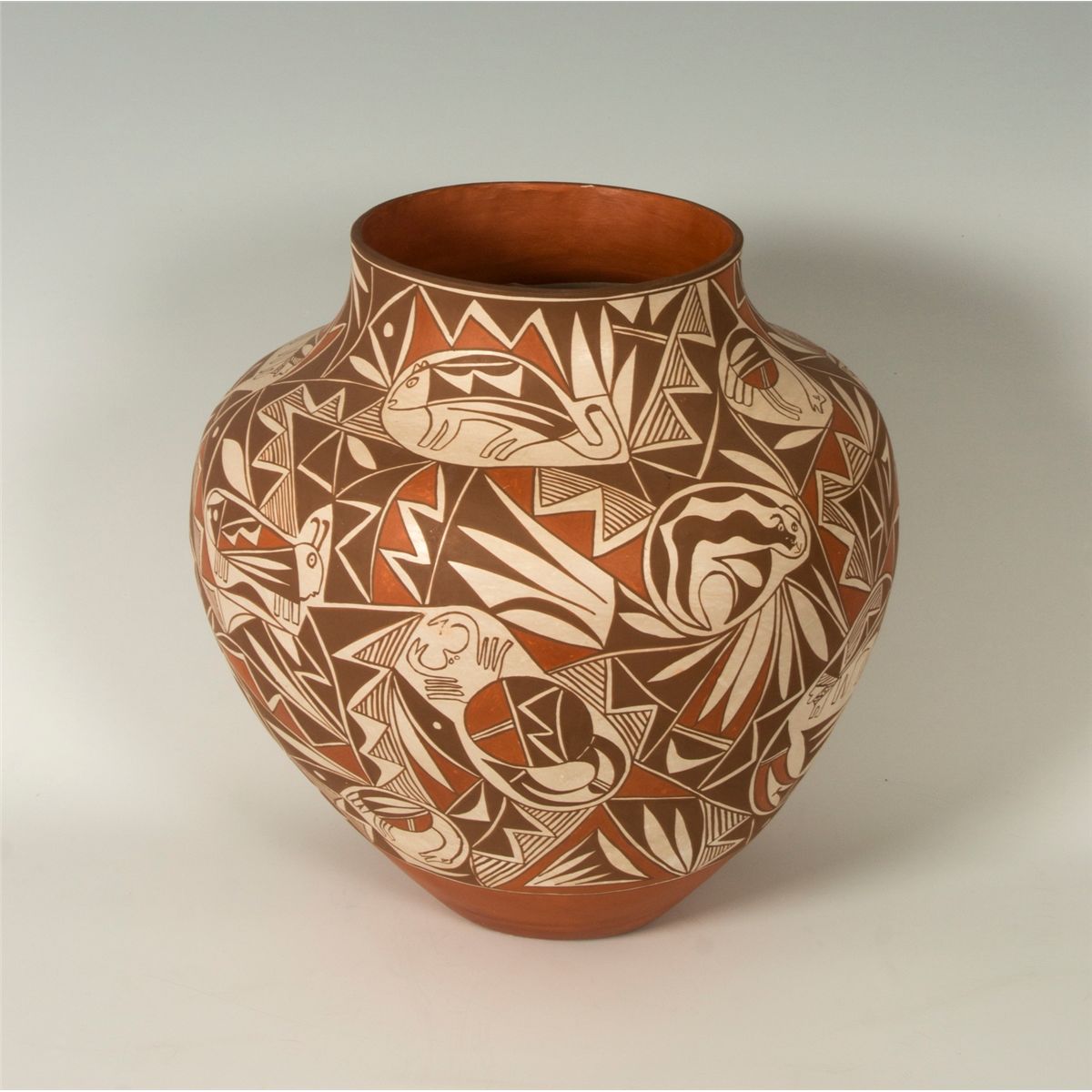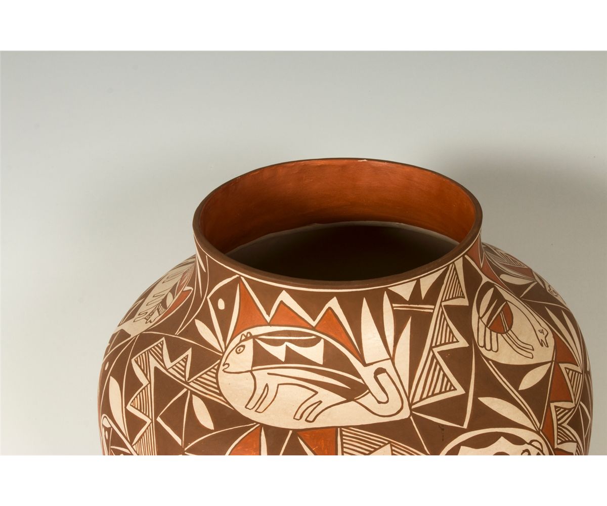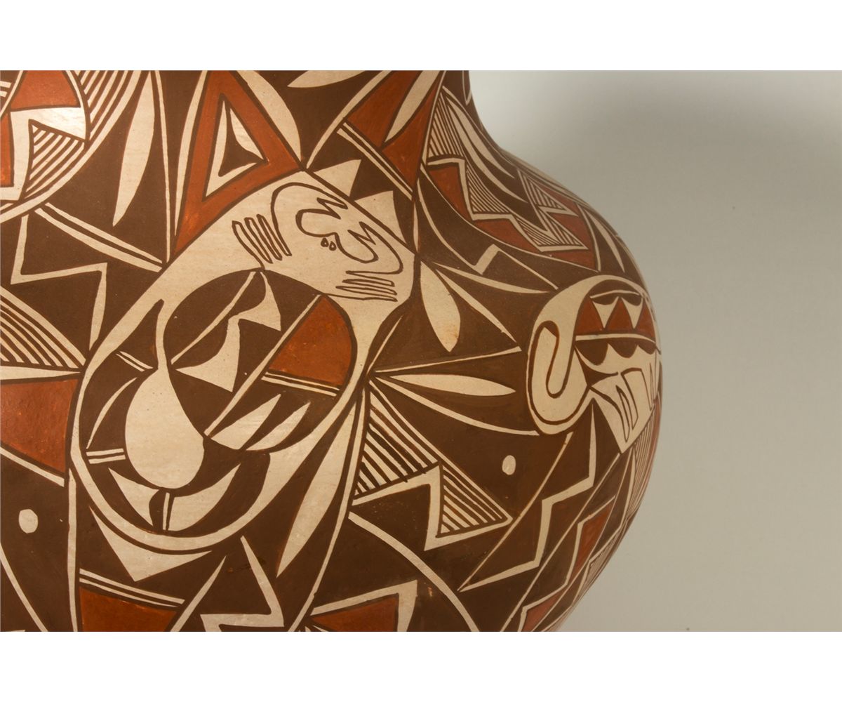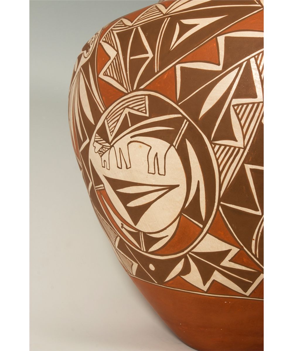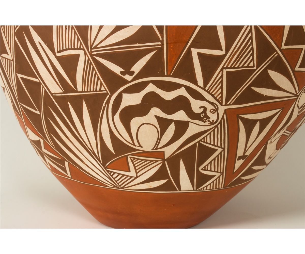 Acoma Jar by Loretta Joe (1958 - ). 16" x 14". Subdued polychrome geometric designs with animals throughout. Signed on base: L JOE, ACOMA, N.M. Provenance: Golden Eagle Trading Co.