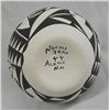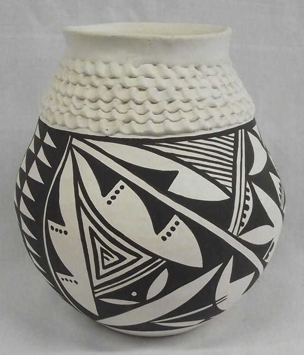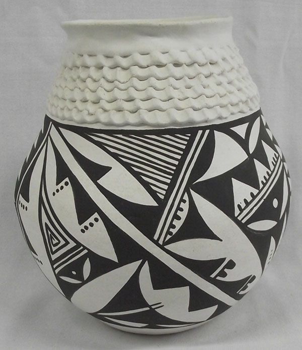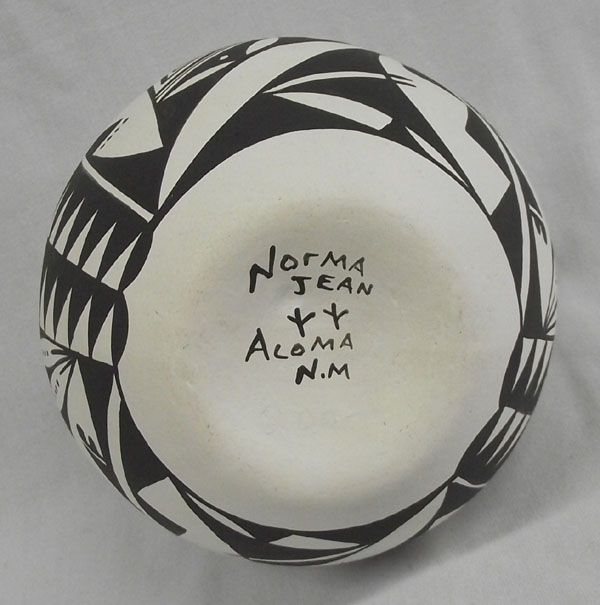 From the Nick and Suzanne Nicholas Collection we have an Acoma Jar by Norma Jean Ortiz, traditional black on white abstract and geometric Native American designs, measures 7.5''H x 7.25''W, highly textured flared rim, signed on bottom by artist Norma Jean Acoma, Norma Jean Ortiz (Acoma) lives in the ancient Acoma ''Sky City'' in New Mexico. There she creates beautiful works of traditional Acoma artwork including corrugated pottery, clay sculptures, and paintings. Norma Jean Ortiz has been making pottery for over 35 years. Her pottery has also been referred to as Anasazi pots because it is of the same style created by the ancient Anasazi people who used this pottery for cooking. Norma Jean learned the traditional Acoma coil method of pottery making as a child by observing her great-grandmother and grandmother. To give the pots their rigid texture, Norma Jean uses a deer antler to press into the strips while she is doing the coiling, this creates the pot's corrugation.