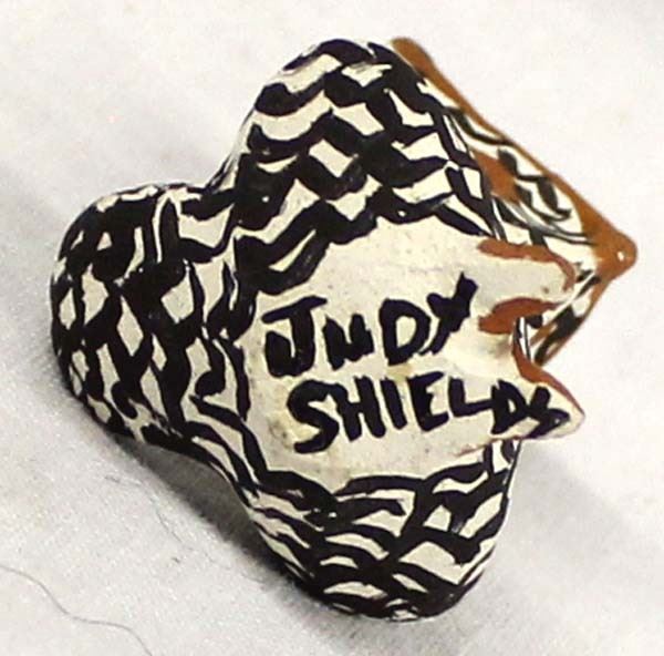 Native American Acoma Miniature Pottery Owl by Judy Shields, measures .75'' x 1'' and is signed on the bottom