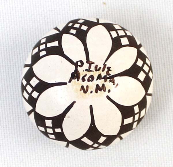 Native American Acoma Miniature Pottery Seed Jar by P. Iule, measures .75'' x 1.5'' and is signed on the bottom