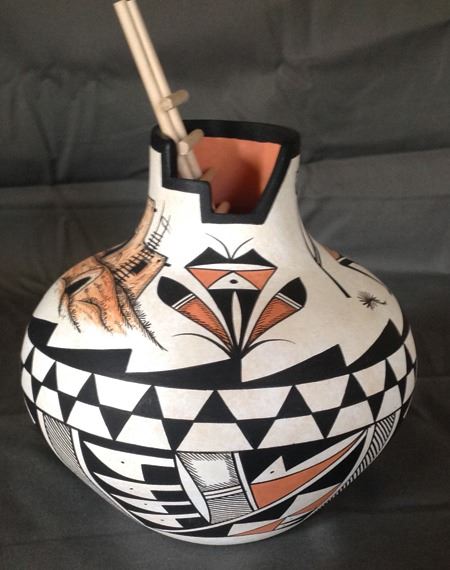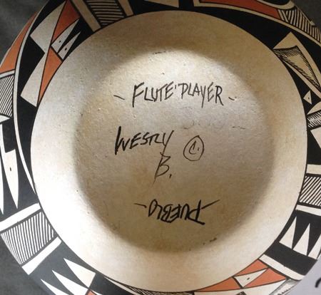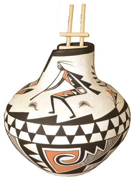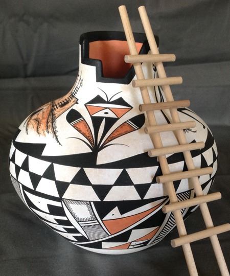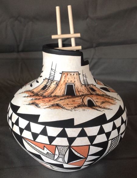 Ca. 2017, Contemporary Acoma/Navajo pottery with flute player, depicting a Kiva, and ladder. Very good condition. 7" x 7"