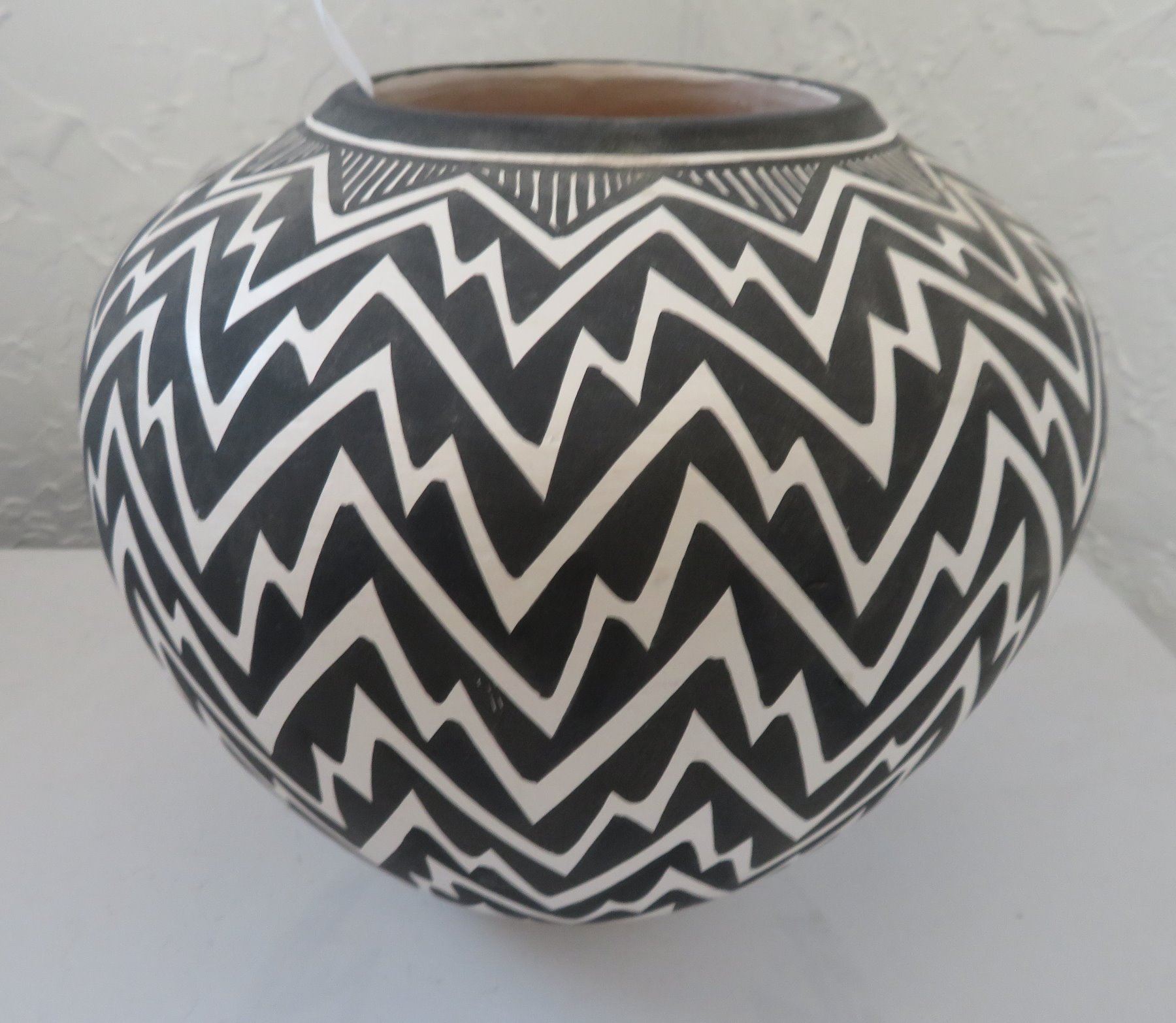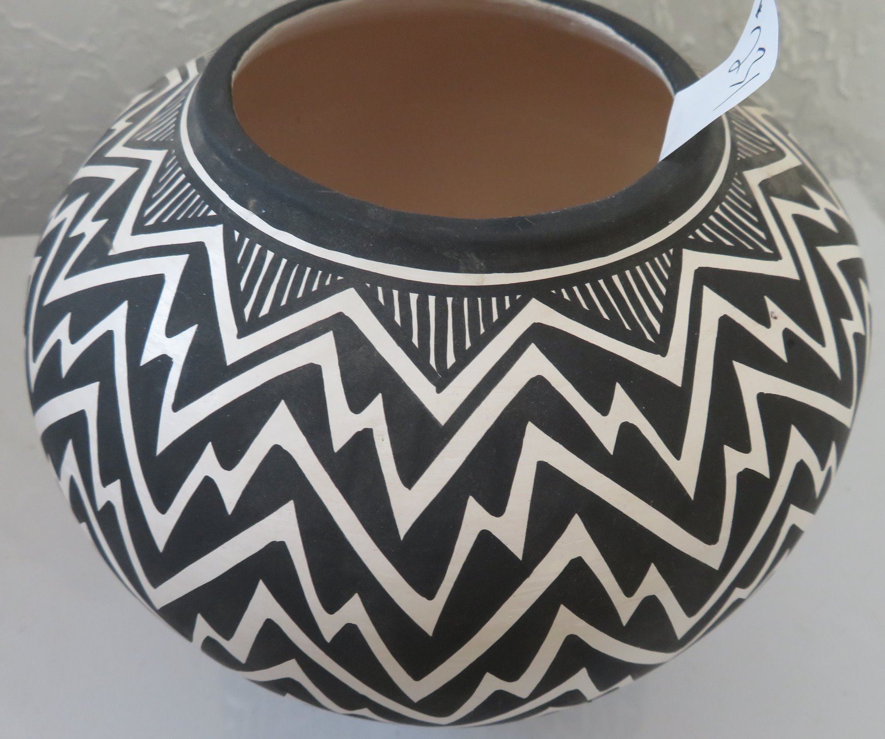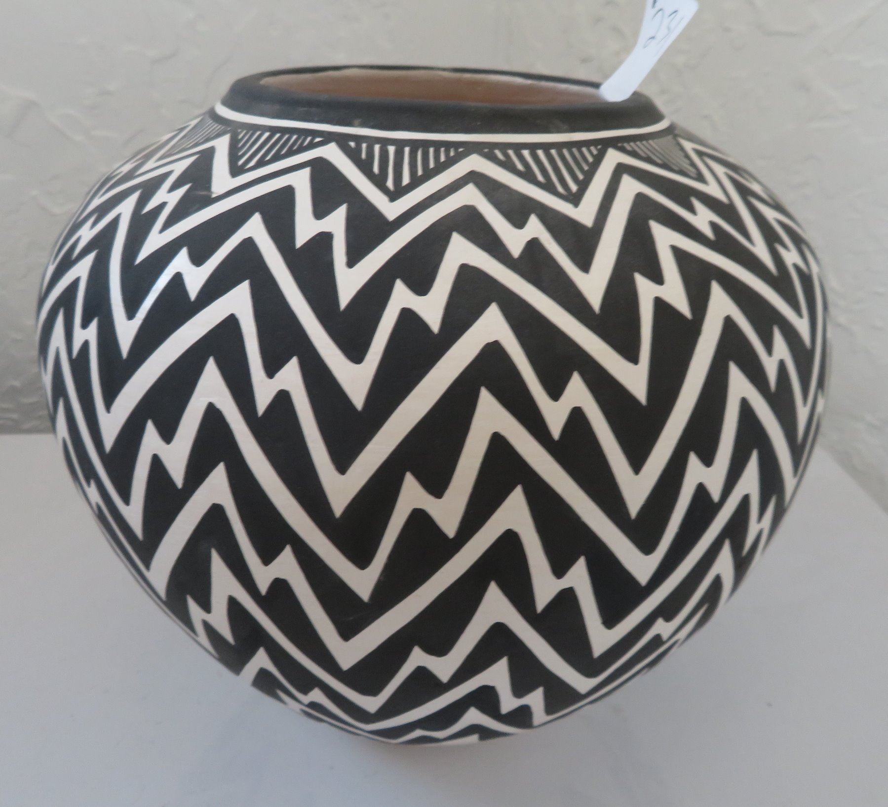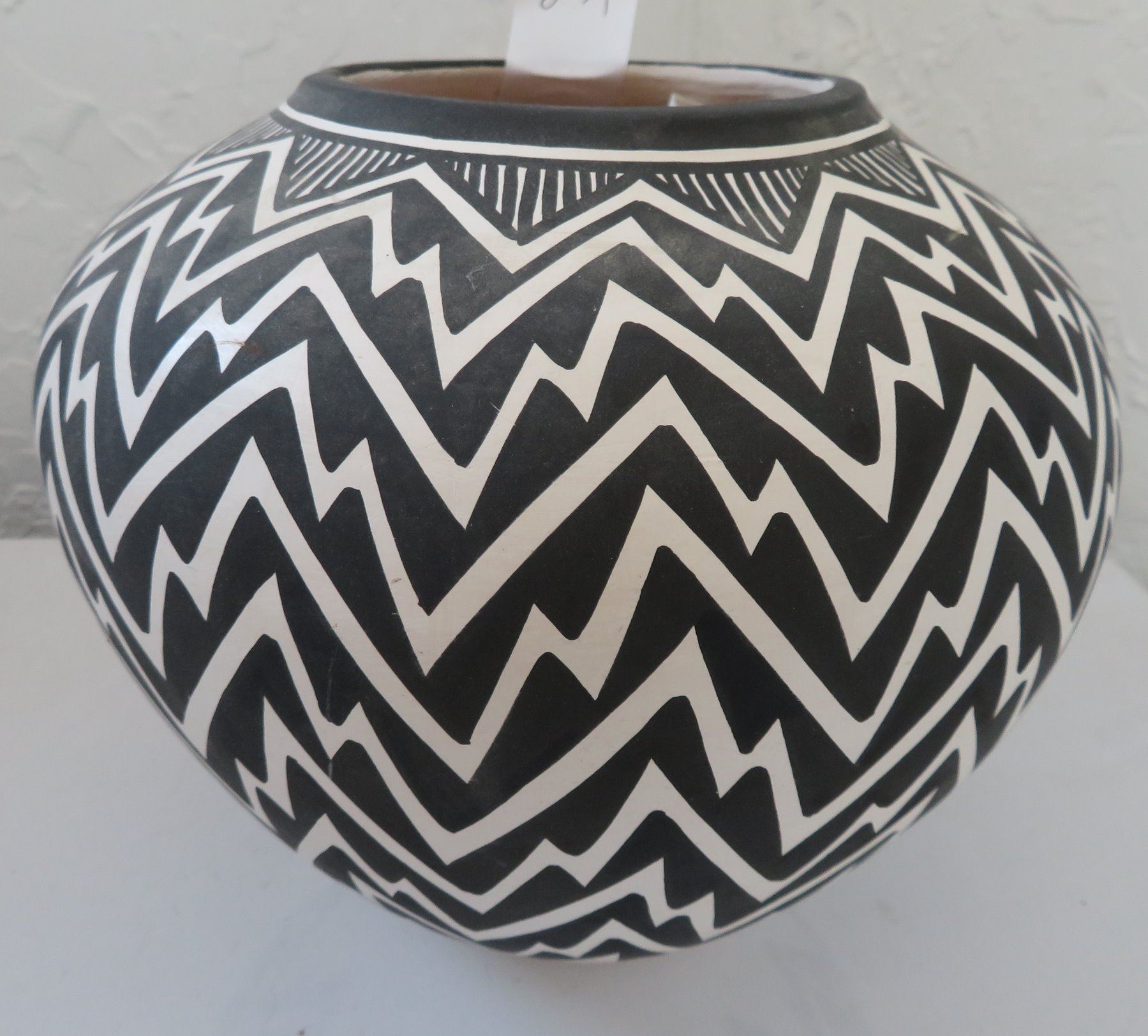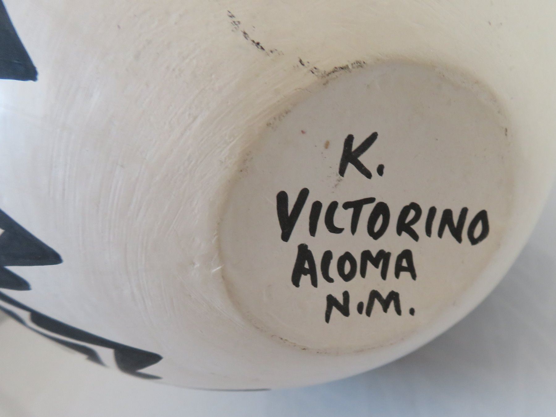 Acoma Negative Olla, c. 1970s. Made of clay and paint, the item measures 7" x 8". Signed K Victorino, Acoma. Condition: Good, see images. Shipping: $36.50 w/insurance and signature, due to size, double-boxed.