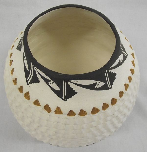 From the Collection of Nick & Suzanne Nicholas. Acoma Norma Jean Pottery Jar. This beautiful polychrome jar from the Acoma Pueblo stands approx 7.25'' high n 7'' wide at it's largest point. Attractive geometric and feather designs. Norma Jean Ortiz (Acoma) lives in the ancient Acoma ''Sky City'' in New Mexico. There she creates beautiful works of traditional Acoma artwork including corrugated pottery, clay sculptures, and paintings. Norma Jean Ortiz has been making pottery for over 35 years. Her pottery has also been referred to as Anasazi pots because it is of the same style created by the ancient Anasazi people who used this pottery for cooking. Norma Jean learned the traditional Acoma coil method of pottery making as a child by observing her great-grandmother and grandmother. To give the pots their rigid texture, Norma Jean uses a deer antler to press into the strips while she is doing the coiling, this creates the pot's corrugation.