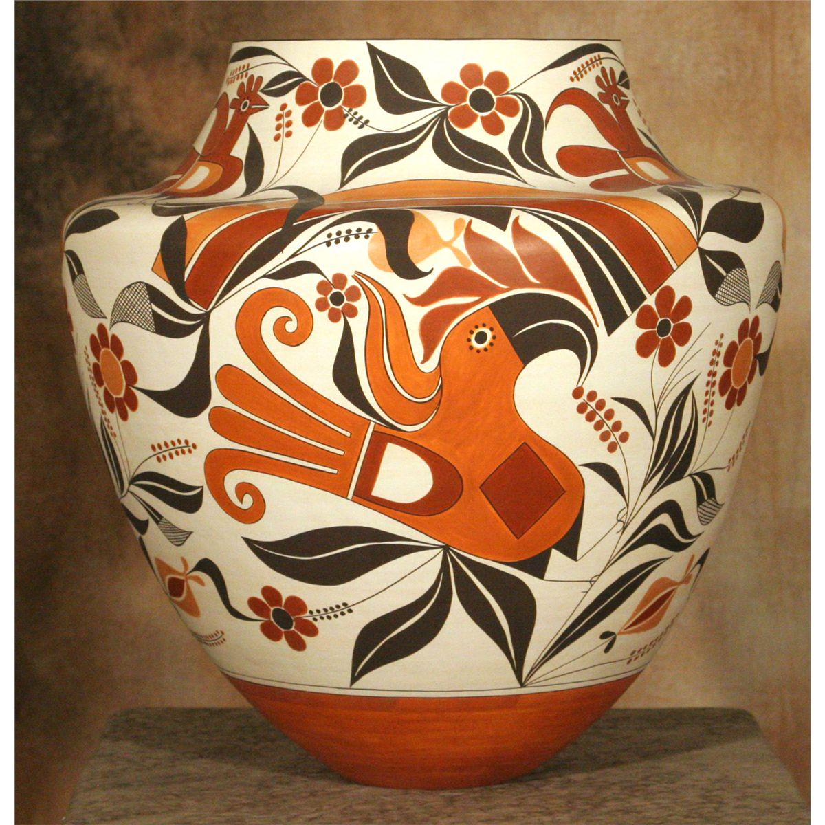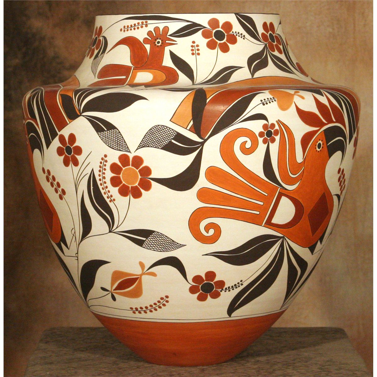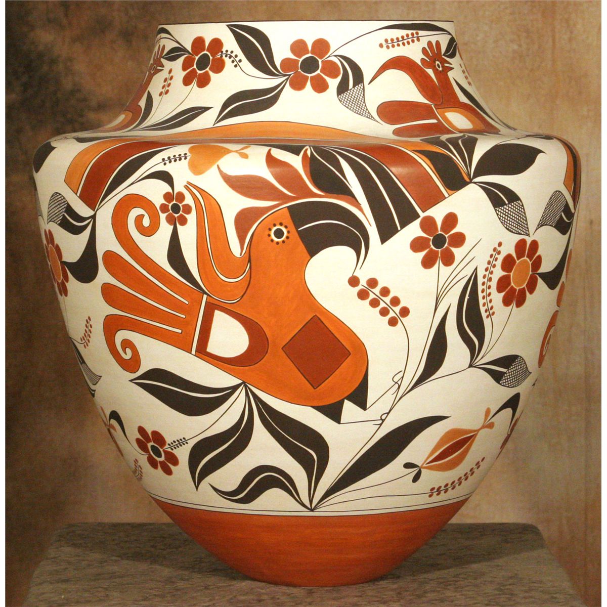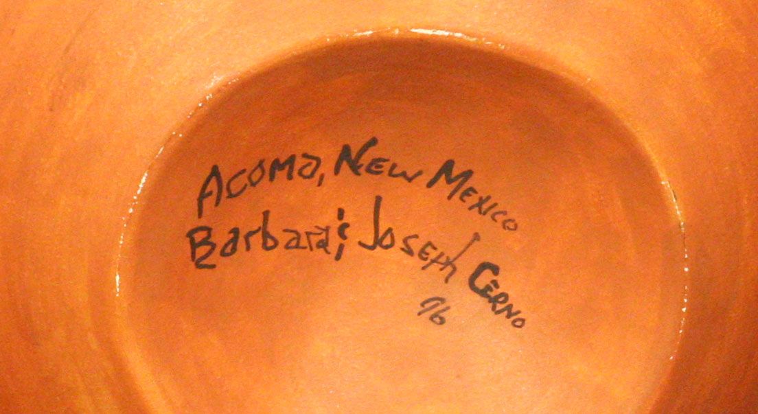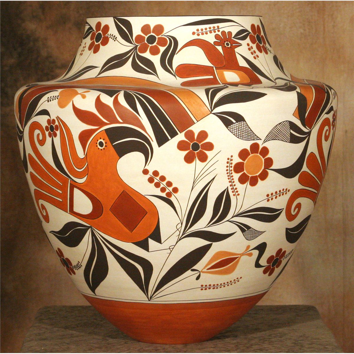 Acoma Olla by Barbara Cerno (1951 - ) and Joseph Cerno (1947 - ). 24" x 20". A true masterpiece in an extra large size. Bird designs in classic Acoma colors. Signed: ACOMA, NEW MEXICO, BARBARA and JOSEPH CERNO, 96.