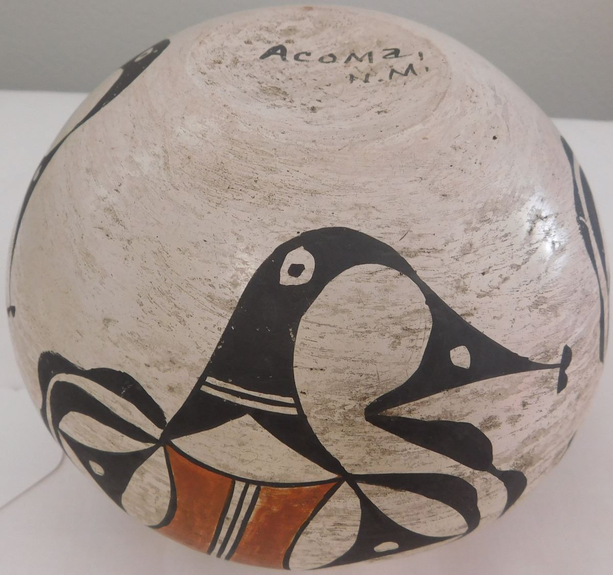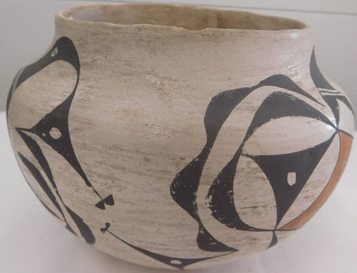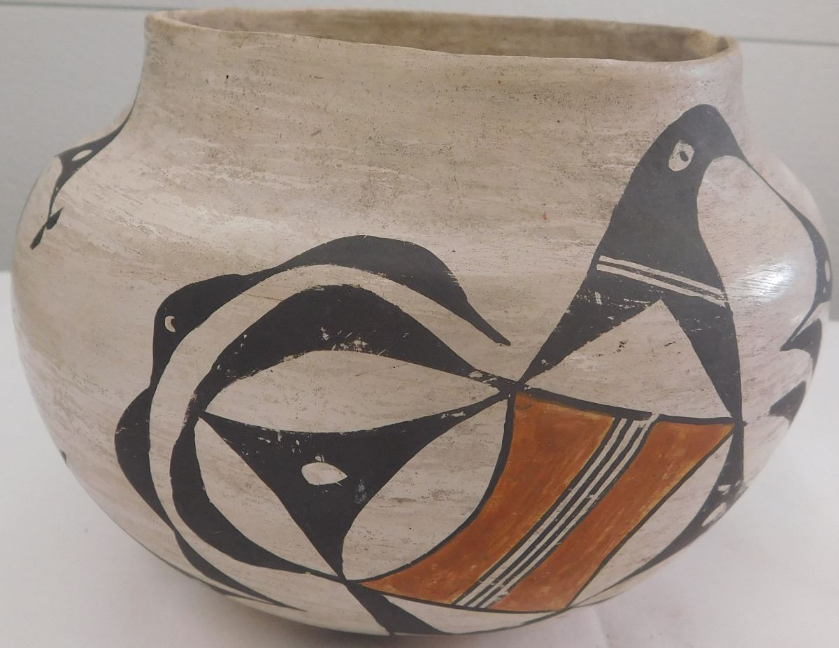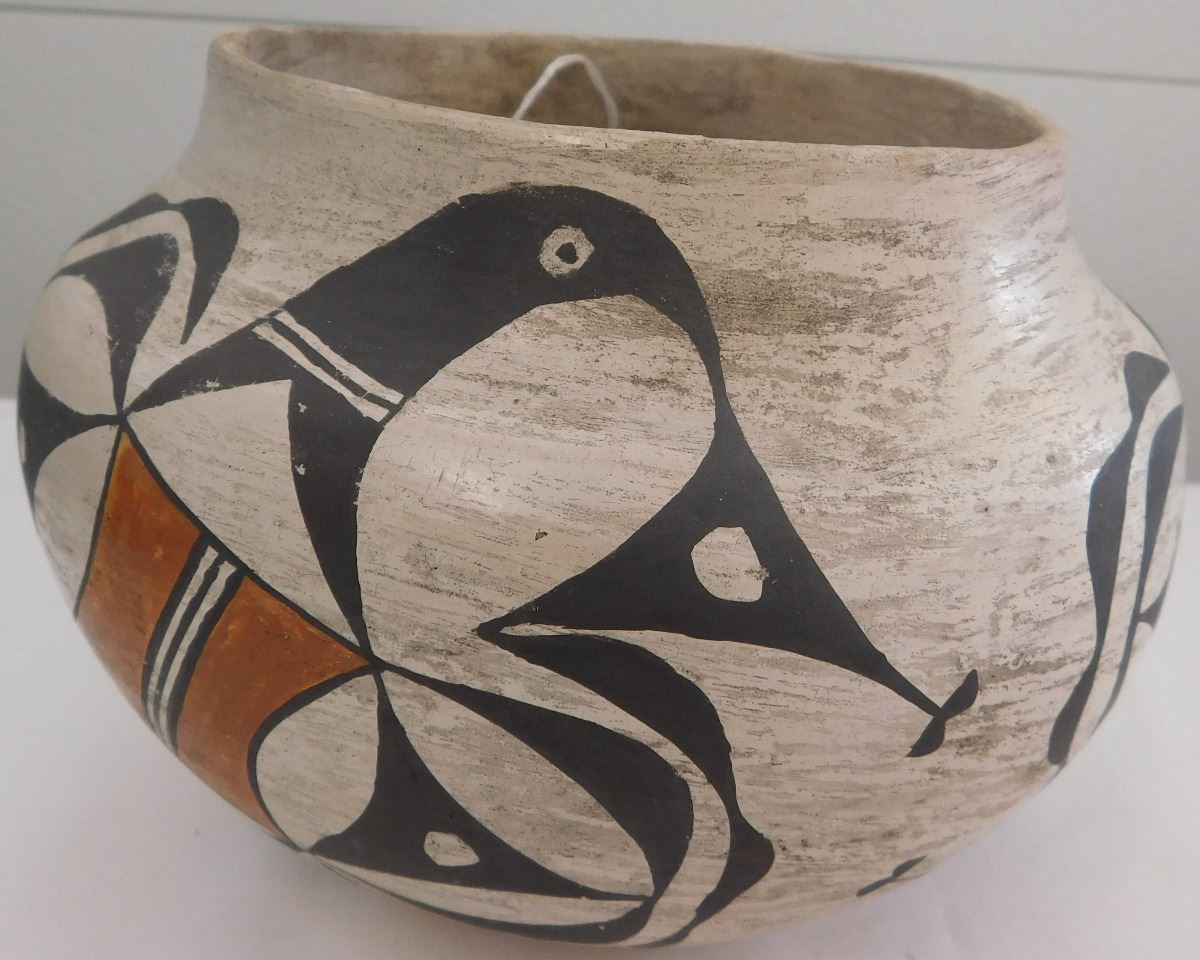 Acoma Olla, probably from the 1930s. Item is made of clay and paint, measuring 5.5" x 7". Signed Acoma, New Mexico. Nice paint on this very well made olla. Condition: Good, minor rim chip, see images. Shipping: $26.50, must be double-boxed.