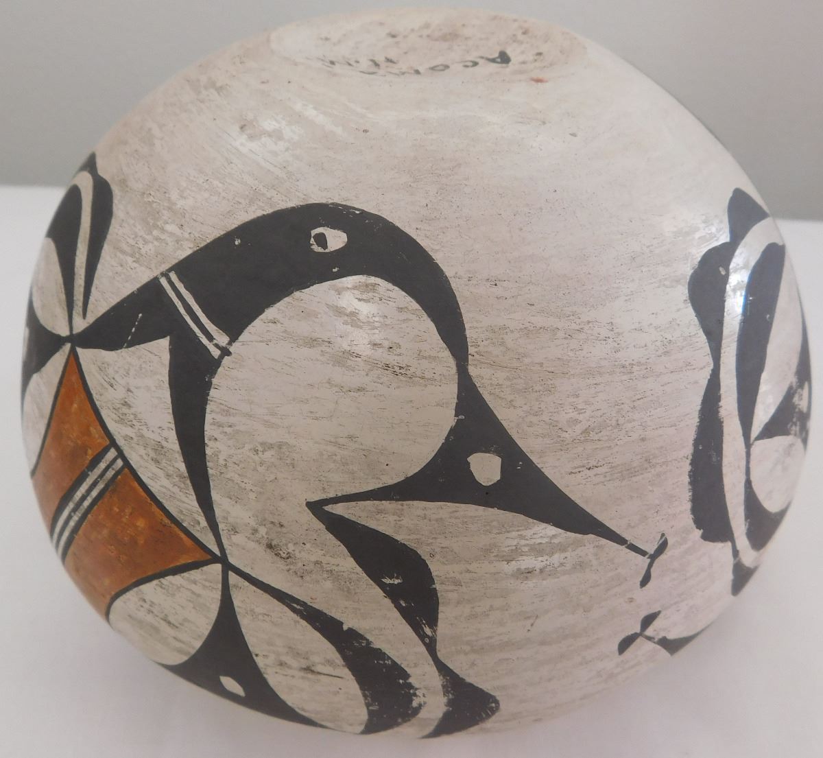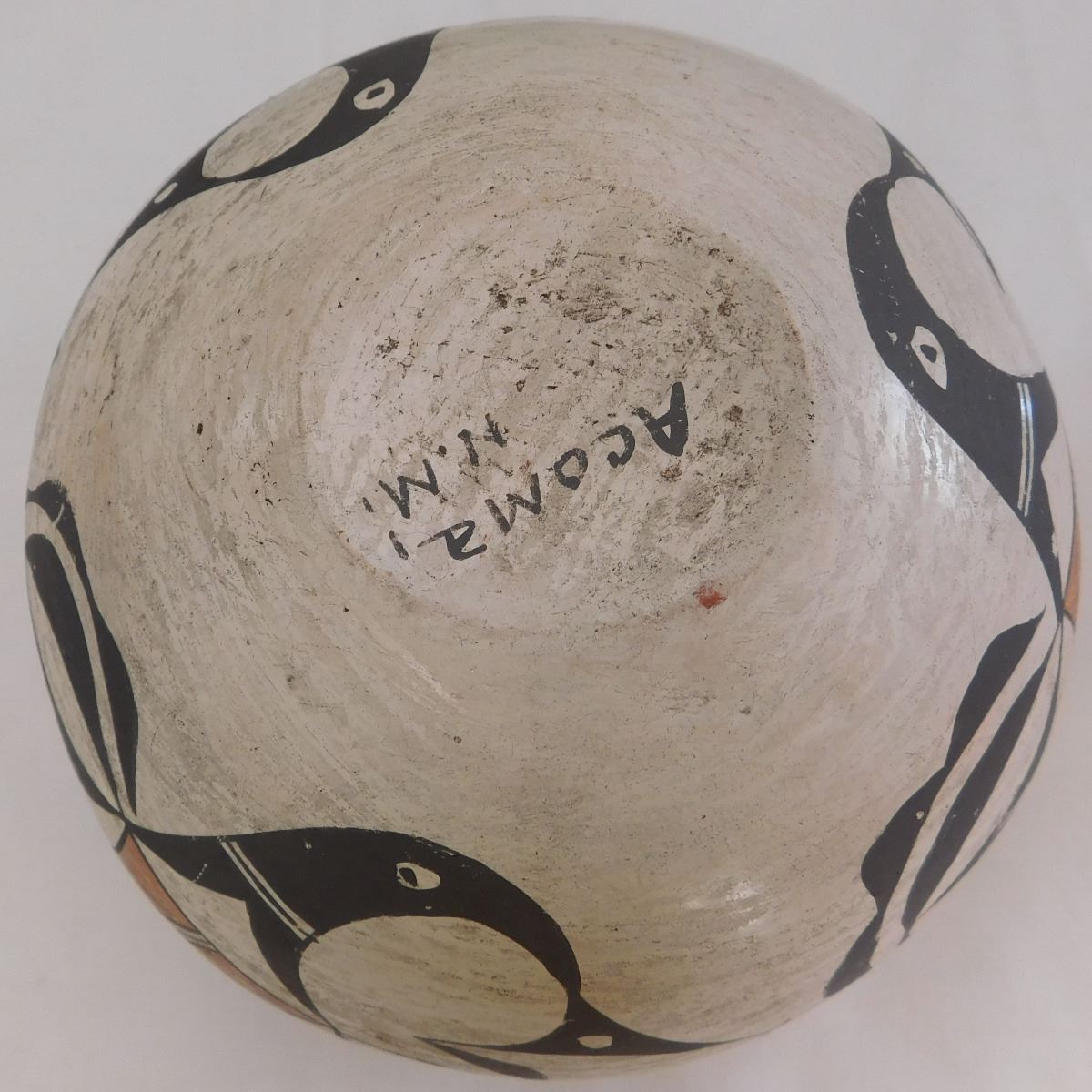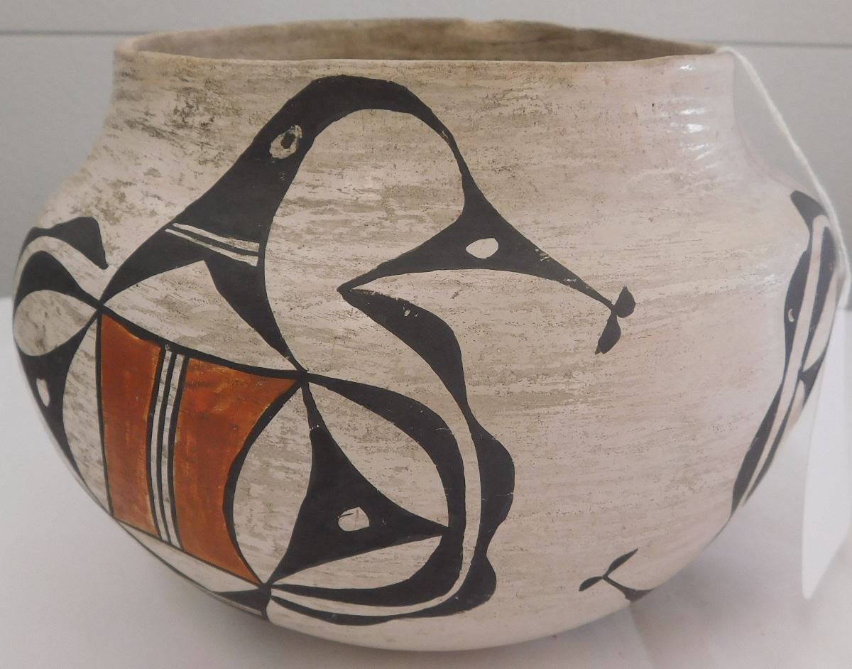 Acoma Olla, probably from the 1930s. Item is made of clay and paint, measuring 5.5" x 7". Signed Acoma, New Mexico. Nice paint on this very well made olla. Condition: Good, minor rim chip, see images. Shipping: $26.50, must be double-boxed.