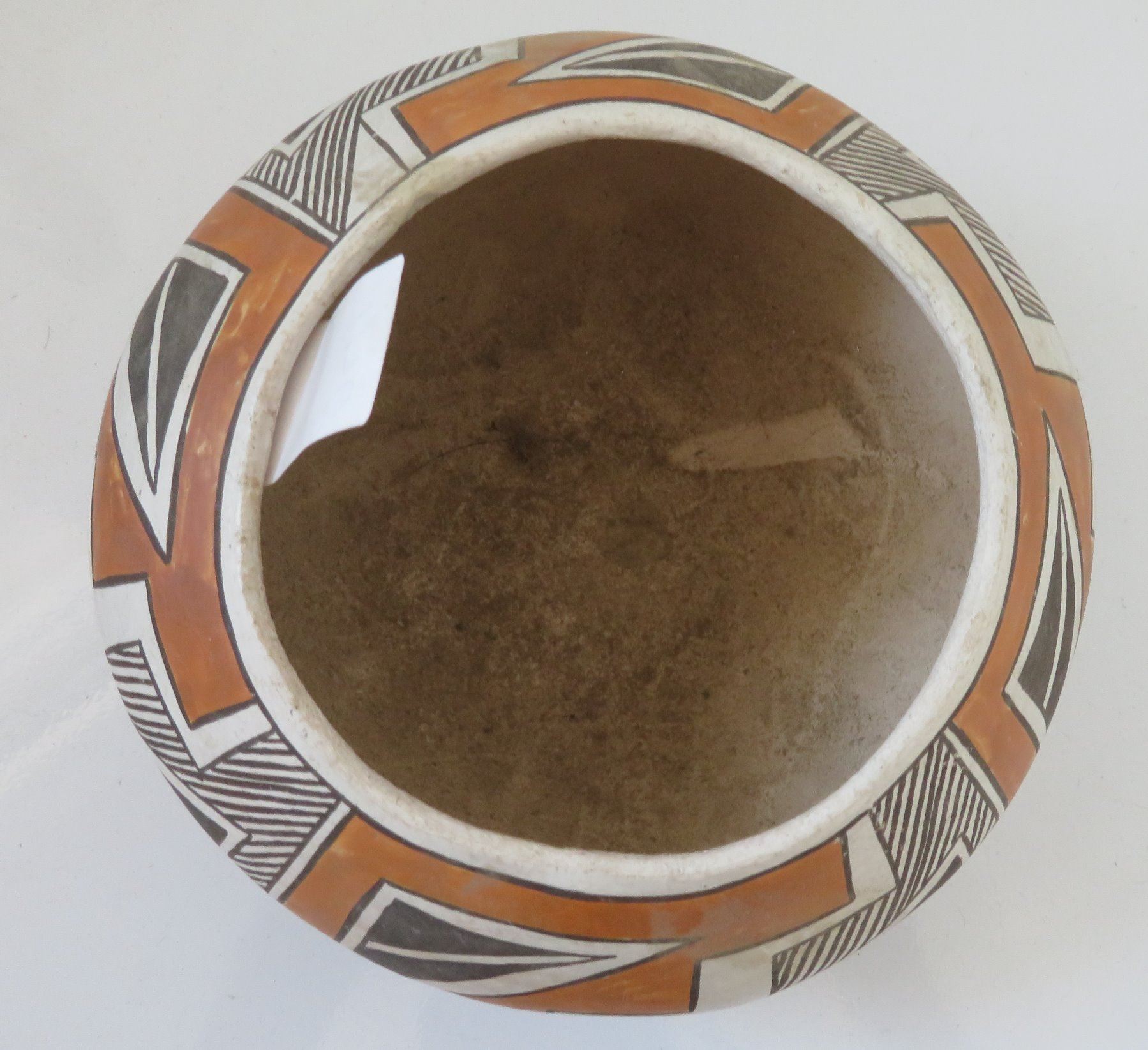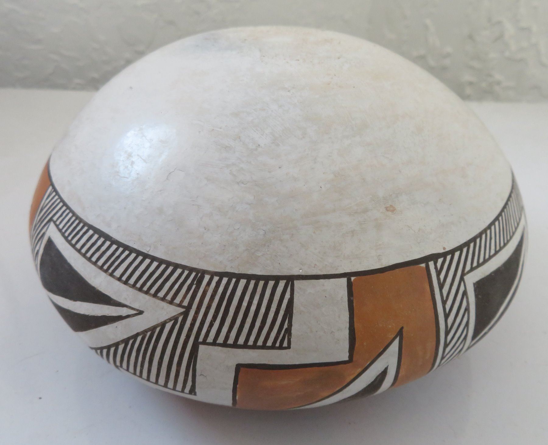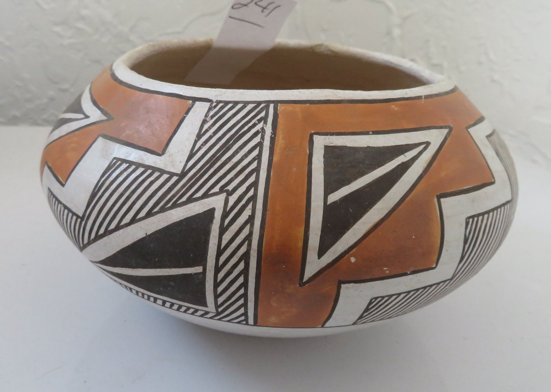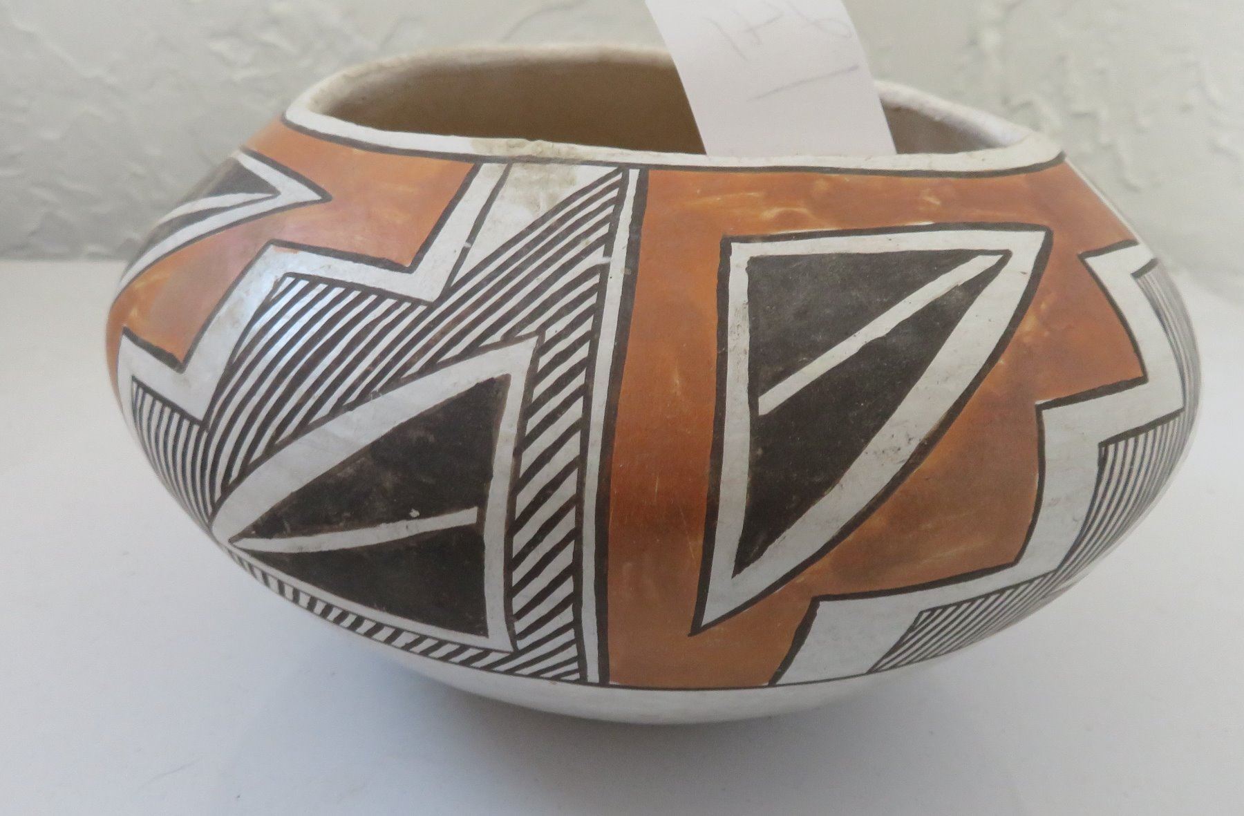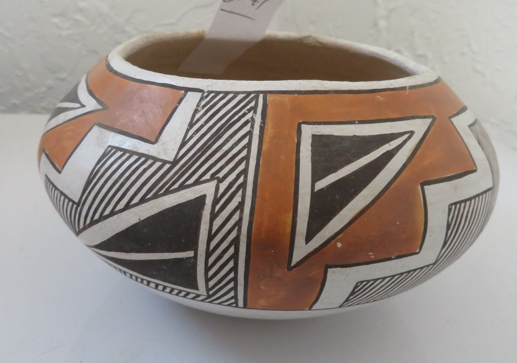 Acoma Olla, c. 1950s. Made of clay and paint, the item measures 7" x 4". Acoma, New Mexico. Polychrome pot. Condition: Good, see images. Shipping: $28.50 w/insurance and signature, double-boxed.