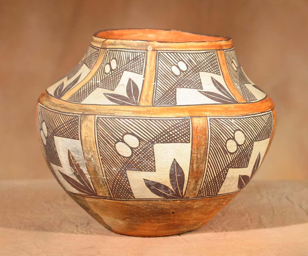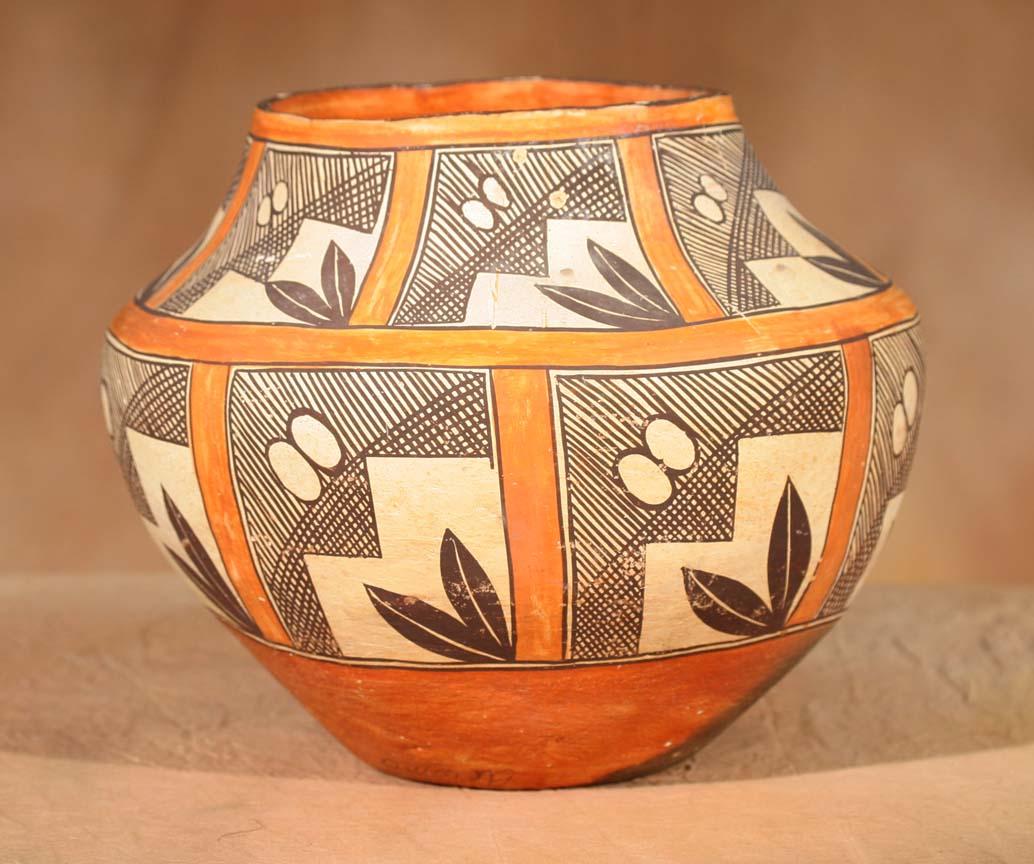 Acoma Jar. 10" x 10". Polychrome with fine line hatching and floral designs. Circa 1890-1900. (est $2,500-4,000). Provenance: Bethany College, Lindsborg, KS. For condition reports please visit: www.auctioninsantafe.com/cr2011.pdf