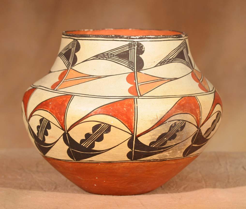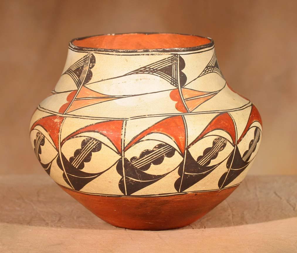 Acoma Polychrome Jar. 9 ½" x 9 ½". Featuring abstract flying bird designs. Circa 1890. (est $2,500-4,000). Provenance: Bethany College, Lindsborg, KS. For condition reports please visit: www.auctioninsantafe.com/cr2011.pdf