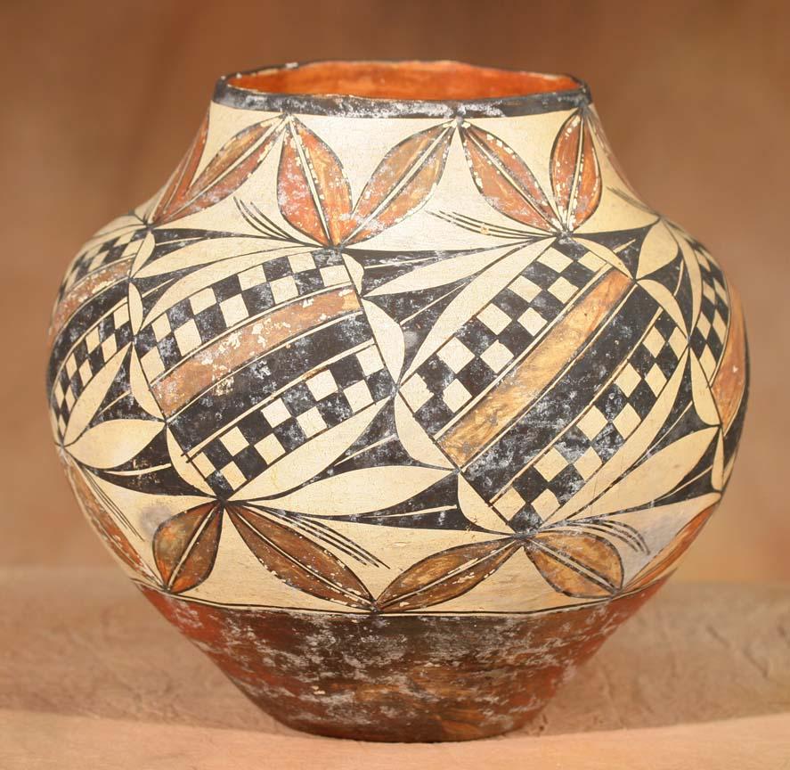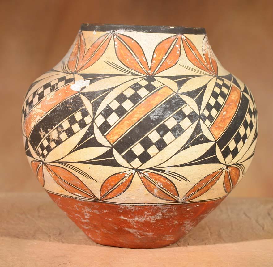 Acoma Polychrome Jar. 11 ½" x 10 ½". Checkerboard and floral designs. Circa 1890. (est $2,500-3,500). Provenance: Bethany College, Lindsborg, KS. For condition reports please visit: www.auctioninsantafe.com/cr2011.pdf
