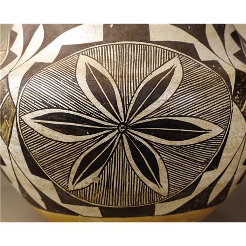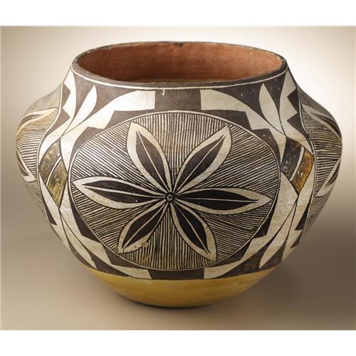 <B>Acoma Polychrome Pottery Jar</B></I><BR>Circa 1930<BR>Height 9 in. Diameter 11 1/2 in.<BR><BR>This three-color olla features a concave base, flaring sides, a high shoulder, and tapering neck. The body is decorated with a single design band consisting of a series of medallions, each enclosing a six petal flower motif set against a finely painted hatched background, and surrounded by a stepped perimeter. The jar has an orange underbody.<BR><BR>Provenance<BR>Bonhams and Butterfields, Sale 7477E, Lot 3368, December 8, 2003.<BR><BR> <BR><BR><B>Important notice: