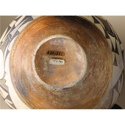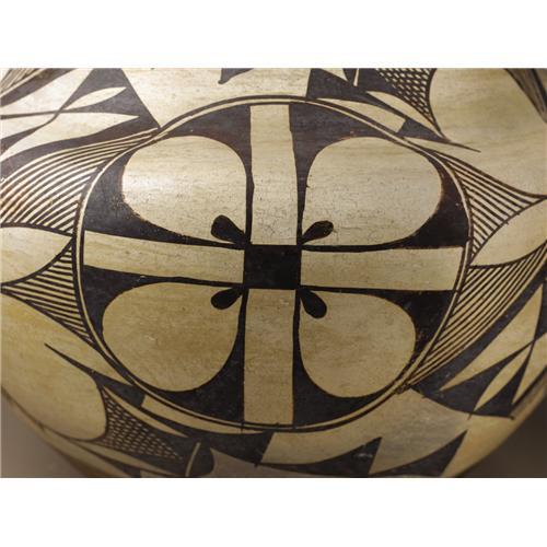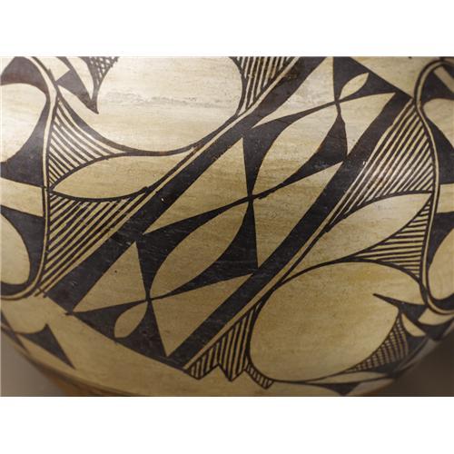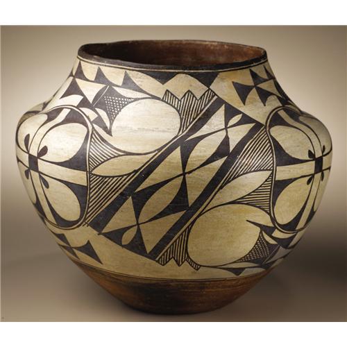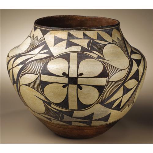 <B>Acoma Polychrome Pottery Jar</B></I><BR>Circa 1920<BR>Height 9 3/4 in. Diameter 12 in.<BR><BR>This classic olla has a concave base, flaring sides, a narrow shoulder, and tapering neck. The three-color jar is painted with a single design band whose elements include three large medallions, each divided into quadrants and flanked by stylized bird and feather motifs that are solid, hatched, and cross-hatched. The medallions are separated by diagonal bands with negative lozenge motifs.<BR><BR>Provenance<BR>Denver Art Museum.<BR>Christie's, Sale 1332, Lot 108, January 12, 2004.<BR><BR> <BR><BR><B>Important notice: